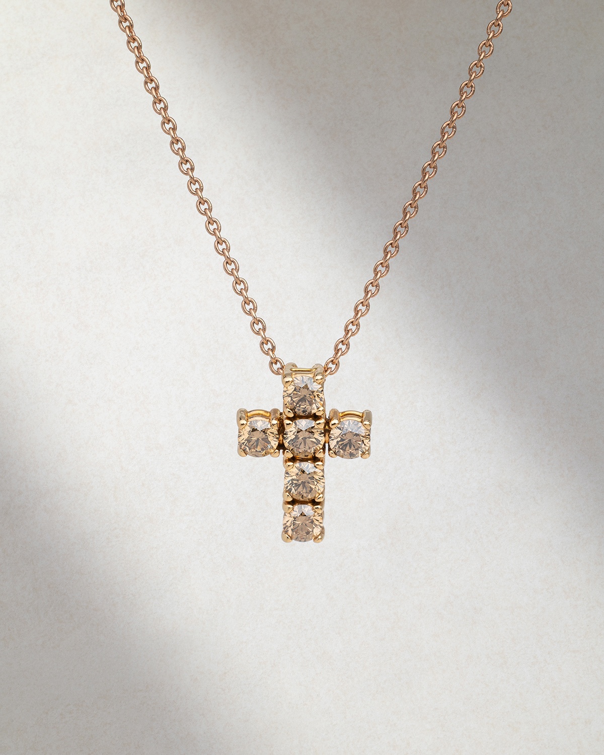 Κομψός σταυρός με αλυσίδα από 18Κ ροζ χρυσό, στολισμένος με καφέ μπριγιάν διαμάντια που προσφέρουν θερμή λάμψη και εκλεπτυσμένο στυλ. Ο σχεδιασμός του σταυρού συνδυάζει καθαρές γραμμές με κομψή συμμετρία, προσδίδοντας μια αίσθηση διακριτικής κομψότητας. Ιδανικό κόσμημα για να προσθέσει μια ξεχωριστή νότα στυλ σε πιο επίσημες ή και μη εμφανίσεις.