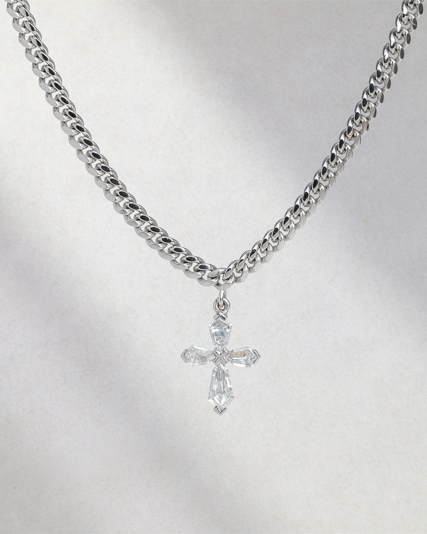 Εντυπωσιακός σταυρός με αλυσίδα από 18Κ λευκό χρυσό, διακοσμημένος με διαμάντια κοπής kite που χαρίζουν ιδιαίτερη λάμψη και σύγχρονη κομψότητα. Η γεωμετρική κοπή των διαμαντιών δημιουργεί ένα ξεχωριστό παιχνίδι φωτός, προσδίδοντας δυναμικό χαρακτήρα και αναδεικνύοντας την ιδιαίτερη αισθητική του κοσμήματος. Ένα εκλεπτυσμένο κόσμημα που μπορεί να φορεθεί μόνο του για minimal αισθητική ή να συνδυαστεί με άλλα κοσμήματα για ένα πιο μοντέρνο και εντυπωσιακό αποτέλεσμα.