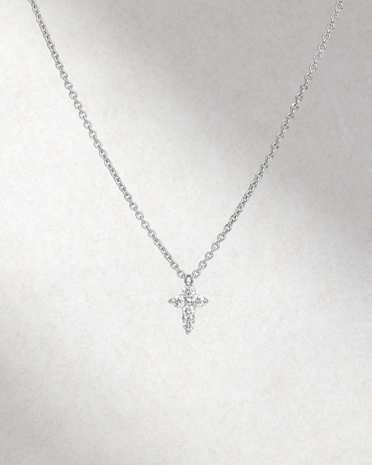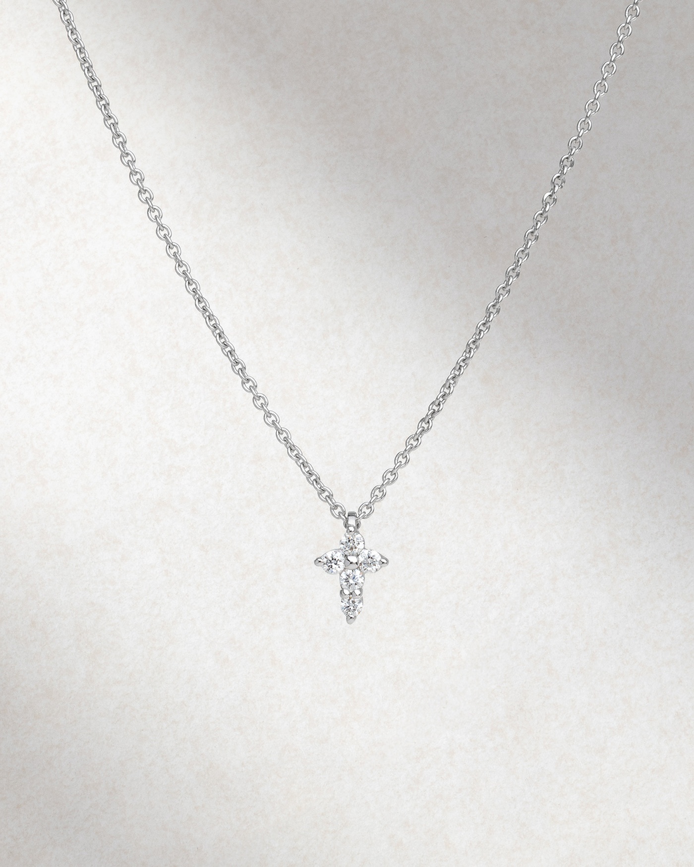 Λαμπερός σταυρός με αλυσίδα σε 18Κ λευκό χρυσό, διακοσμημένος με επιλεγμένα μπριγιάν. Ο λεπτός και κομψός σχεδιασμός του αναδεικνύει τη συμμετρία του σταυρού, ενώ η λάμψη των διαμαντιών προσθέτει διακριτική πολυτέλεια. Ένα κόσμημα ιδανικό για καθημερινή χρήση αλλά και για ιδιαίτερες εμφανίσεις, που φοριέται άνετα μόνο του ή σε συνδυασμό με άλλα minimal κοσμήματα για ένα σύγχρονο και κομψό look.