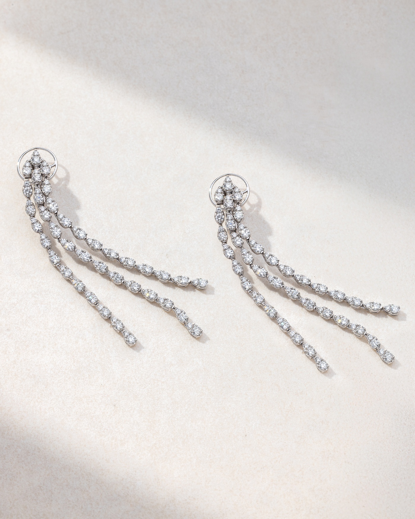 Αριστοκρατικά μακριά σκουλαρίκια σε λευκό χρυσό Κ18 με μπριγιάν, που ακτινοβολούν φως και εκλεπτυσμένη κομψότητα σε κάθε κίνηση. Η σχεδίασή τους συνδυάζει διαχρονική φινέτσα με σύγχρονη πολυτέλεια, αποτυπώνοντας την τέχνη του fine jewelry design. Τολμήστε τα σε μια βραδινή εμφάνιση ή συνδυάστε τα με sleek γραμμές για ένα look απόλυτης λάμψης.