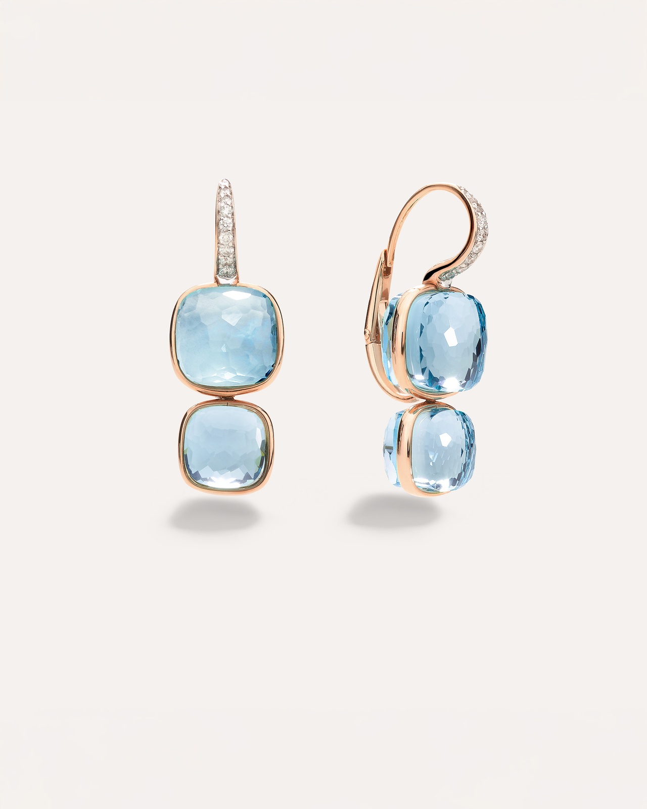 Η εξέλιξη των σκουλαρικιών Nudo έρχεται με αυτά τα κρεμαστά σκουλαρίκια με διπλά μπλε τοπάζ. Οι πολίτιμοι λίθοι διαθλούν το φως που αναδεικνύει μοναδικά το φανταστικό χρώμα τους, χάρη στην μοναδική Clessidra κοπή του οίκου. Μπριγιάν διαμάντια αγκαλιάζουν το λοβό δίνοντας την τελική πινελιά λάμψης.