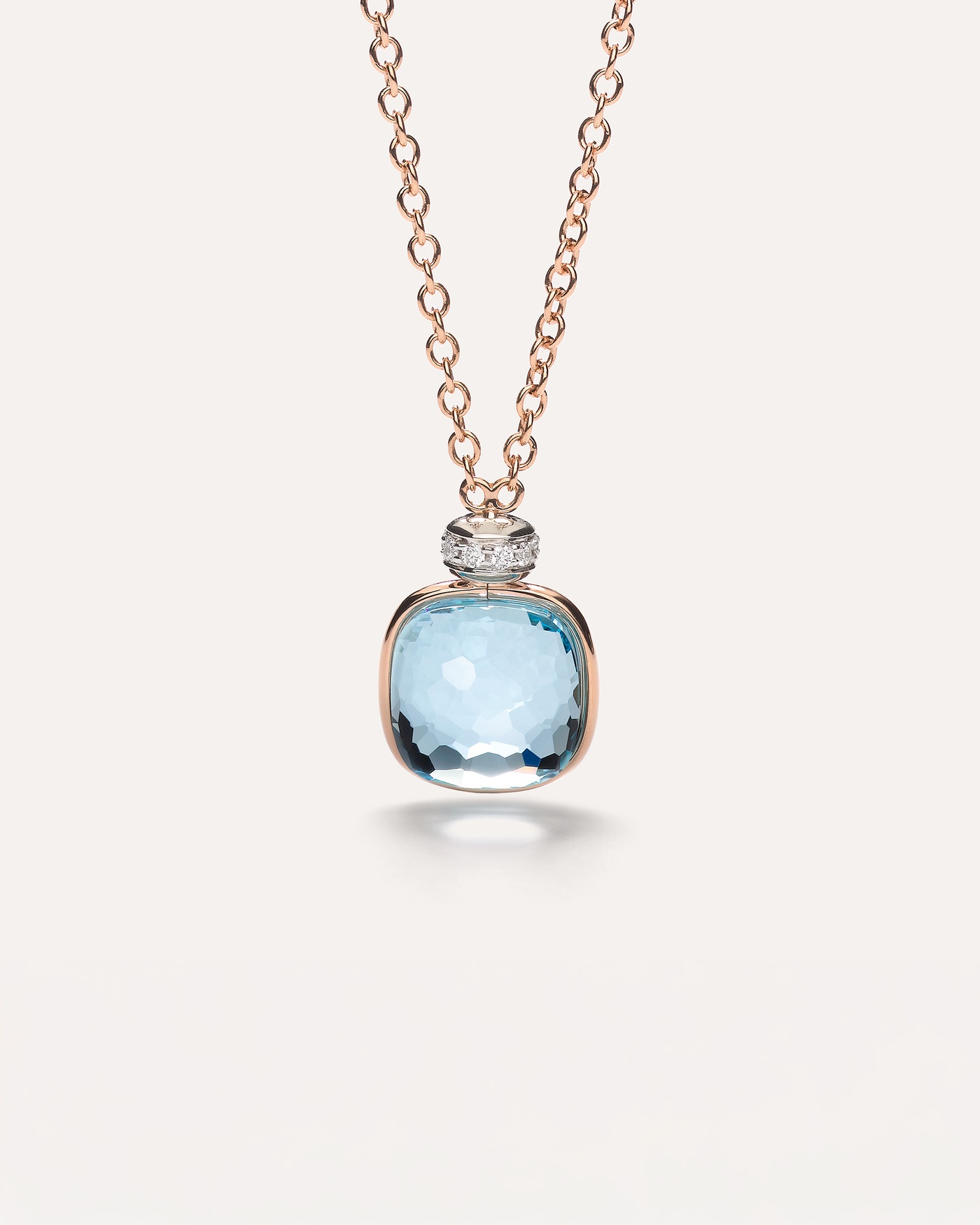 Αυτό το Nudo Κολιέ είναι χειροποίητο από ροζ χρυσό 18 καρατίων και καταλήγει σε ένα μαγευτικό μπλε τοπάζ. Η πέτρα δένεται σε μία λεπτή ρίγα χρυσου που αφήνει το φως να διαθλάται και από τις δύο πλευρές χάρη στην αποκλειστική κοπή "κλεψύδρα" του Οίκου .Ένα κρικάκι μπριγιάν διαμαντιών πάνω από το μπλε τοπάζ ολοκληρώνει το λαμπερό αποτέλεσμα