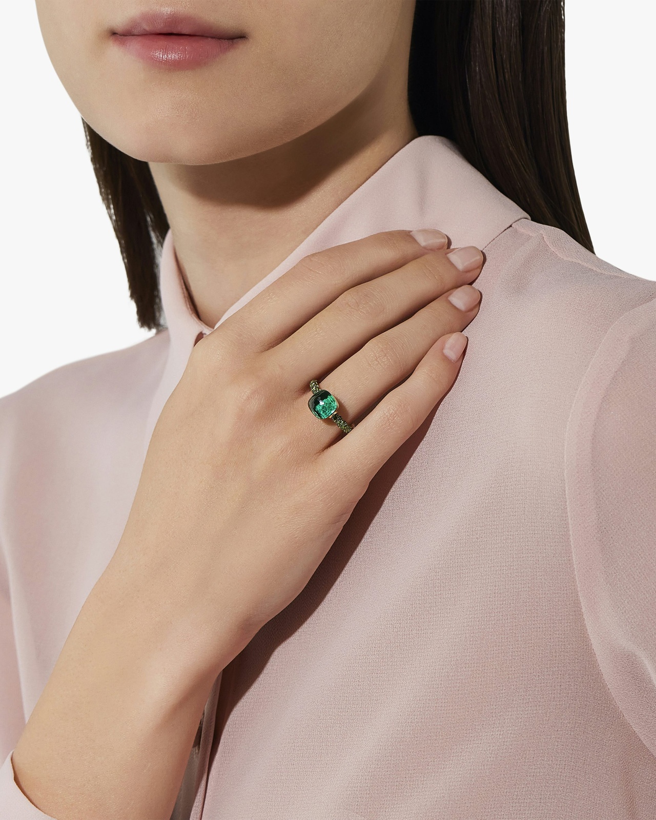 Η Nudo συνεχίζει να είναι η αντιπροσωπευτική σειρά της Pomellato και να συναρπάζει με τα εκθαμβωτικά χρώματα της. Σε αυτό το Nudo δαχτυλίδι ο πρασιολίτης ενώνεται με το μαλαχίτη σε ένα μαγευτικό συνδυασμό πλαισιωμένο από βαθυπράσινους τσαβορίτες
