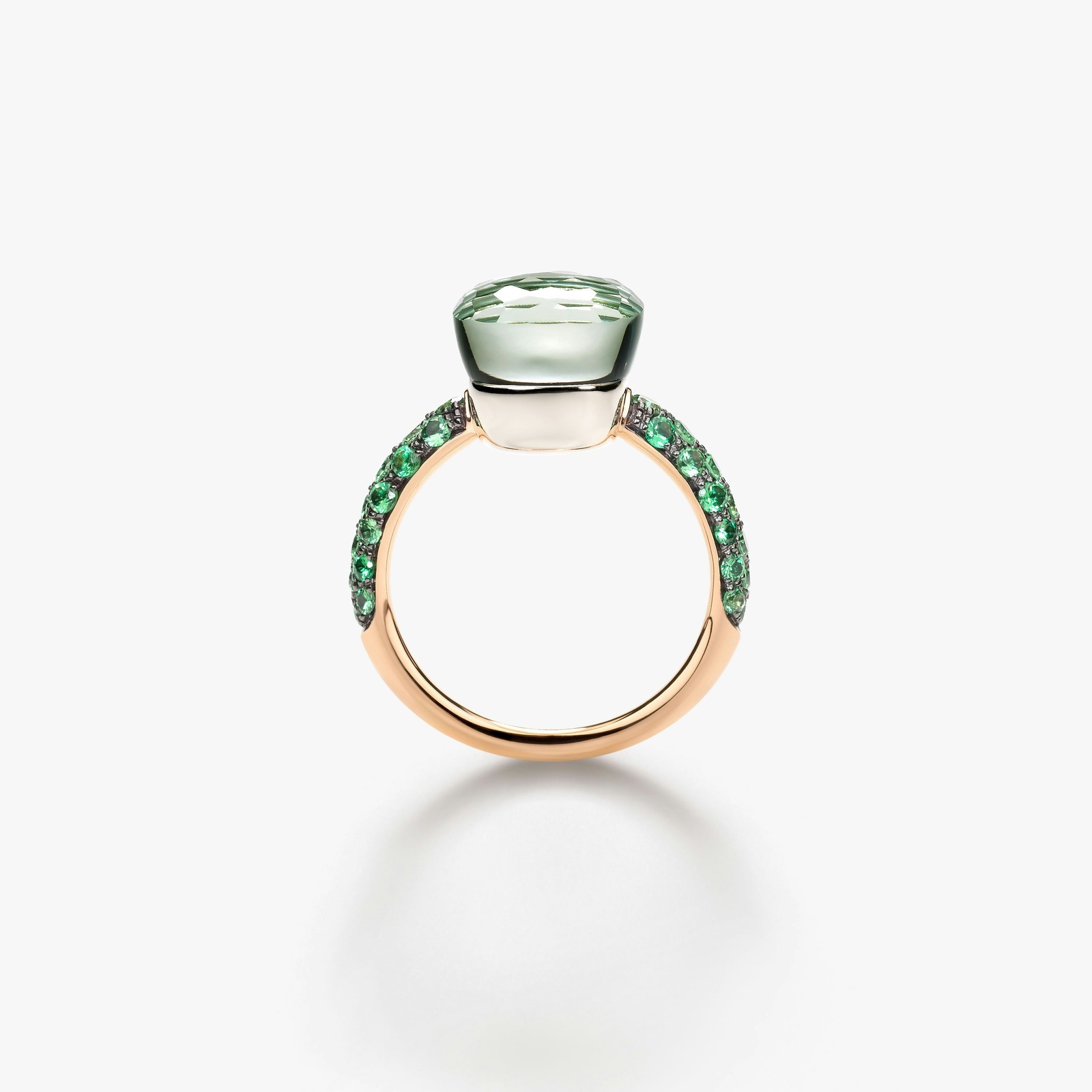 Η Nudo συνεχίζει να είναι η αντιπροσωπευτική σειρά της Pomellato και να συναρπάζει με τα εκθαμβωτικά χρώματα της. Σε αυτό το Nudo δαχτυλίδι ο πρασιολίτης ενώνεται με το μαλαχίτη σε ένα μαγευτικό συνδυασμό πλαισιωμένο από βαθυπράσινους τσαβορίτες