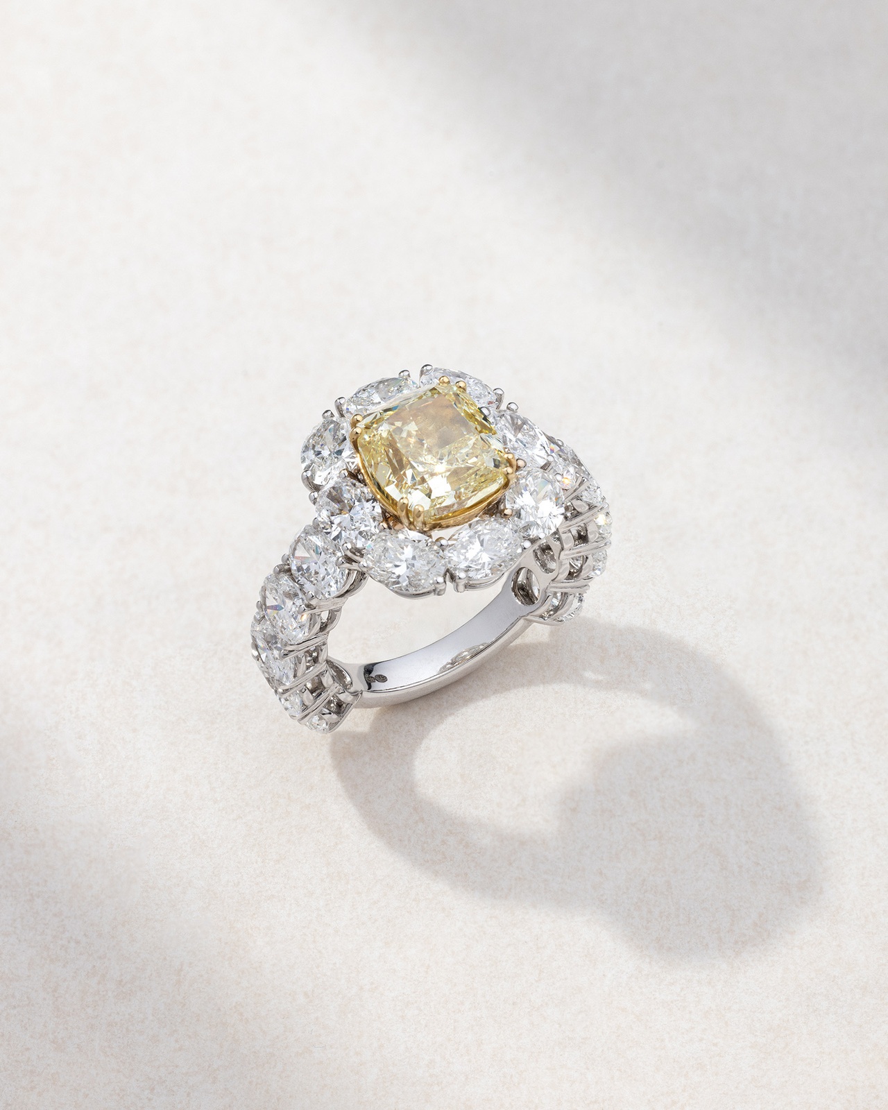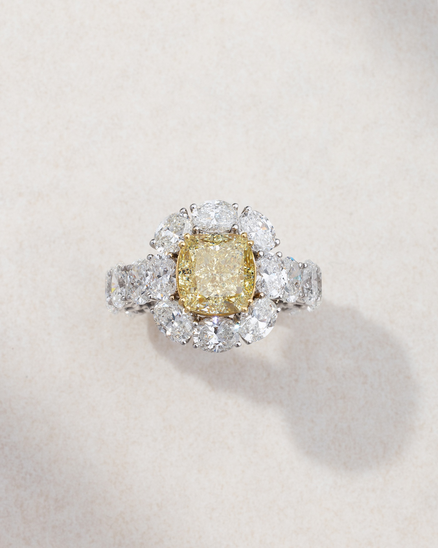 Ένα εξαιρετικά κατασκευασμένο δαχτυλίδι από λευκό χρυσό 18K, με κεντρικό fancy yellow διαμάντι κοπής cushion πλαισιωμένο από διαμάντια κοπής oval. Ο αρμονικός συνδυασμός λευκού και κίτρινου χρυσού αναδεικνύει τη ζεστασιά του fancy yellow διαμαντιού και δημιουργεί ένα εντυπωσιακό, σχεδιαστικά ισορροπημένο αποτέλεσμα. Φορέστε το ως μια τολμηρή δήλωση πολυτέλειας, συνδυάστε το με διακριτικά κοσμήματα ή αφήστε το να λάμψει μόνο του σε ιδιαίτερες περιστάσεις.
