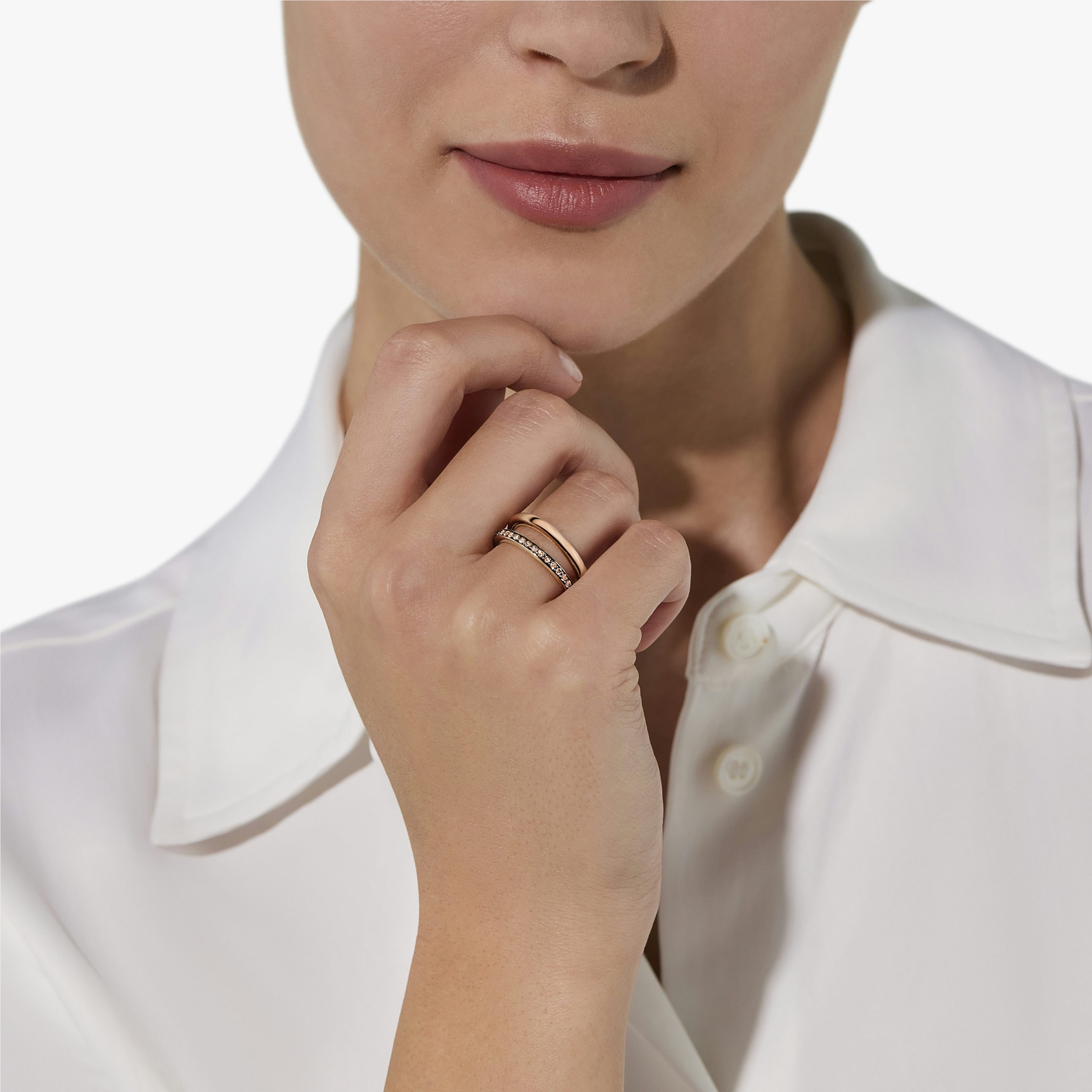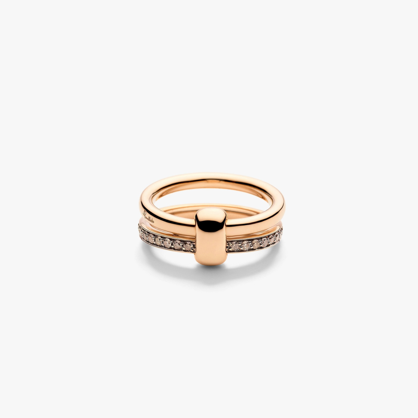 Το διπλό δαχτυλίδι Together αντιπροσωπεύει απόλυτα την φινέτσα της Μιλανέζικης αισθητικής. Δύο τέλειες βέρες ενώνονται σε μία αρμονική σύνδεση συμβολίζοντας τις τέλειες σχέσεις αγάπης που μας ενώνουν. Το υπέροχο ροζ χρυσό κόσμημα με τα καφέ διαμάντια φοριέται με δύο τρόπους