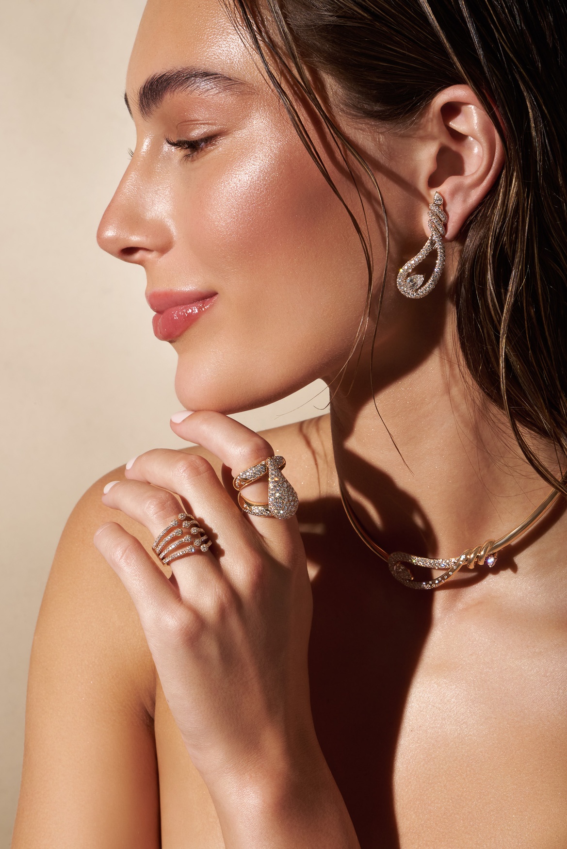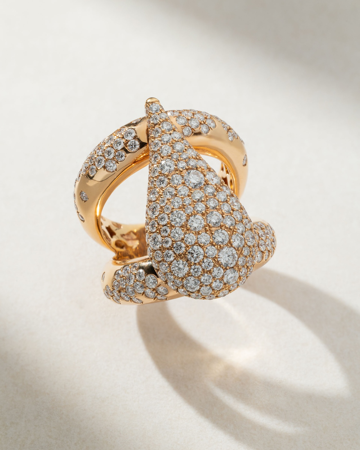This iconic Damaso ring is handcrafted from 18-carat rose gold, featuring a long design decorated with luminous diamonds. A dazzling, shimmering drop hangs between two substantial diamond bands, making it perfect for adornment on your middle finger.