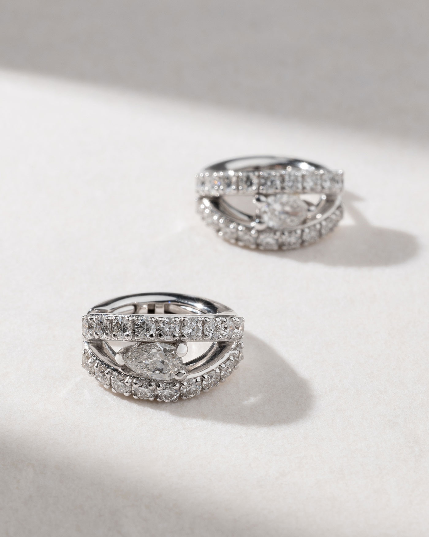 Two double diamond encrusted white gold hoops for each earring are centered with a gleaming pear shaped diamond that looks as though it is floating in the air. Alluring and elegant, they work equally well day and night.