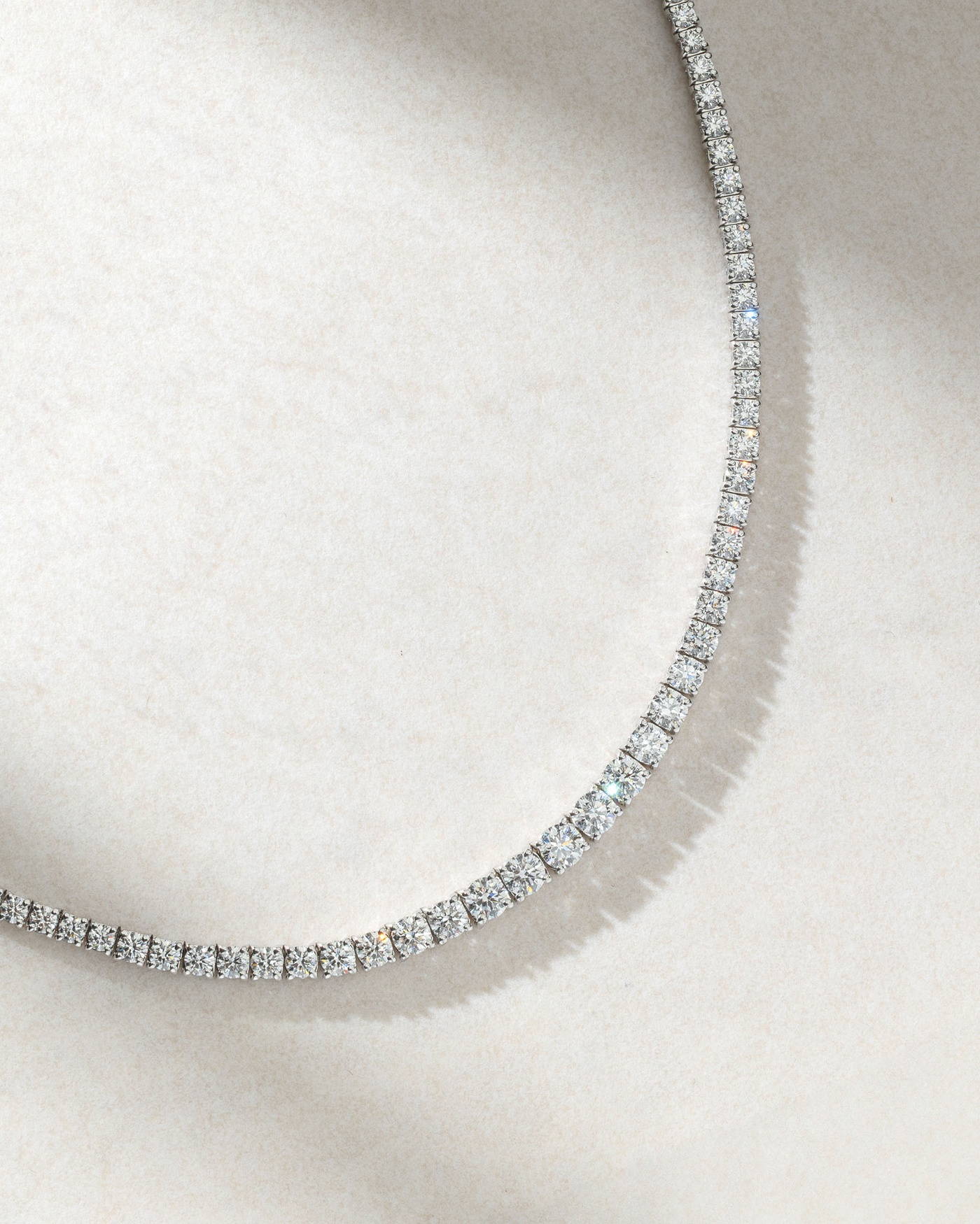 This stunning tennis necklace by the House of Crivelli is hand cast from 18 karat white gold and encrusted with brilliant cut diamonds of premium quality in a modern yet timeless design.