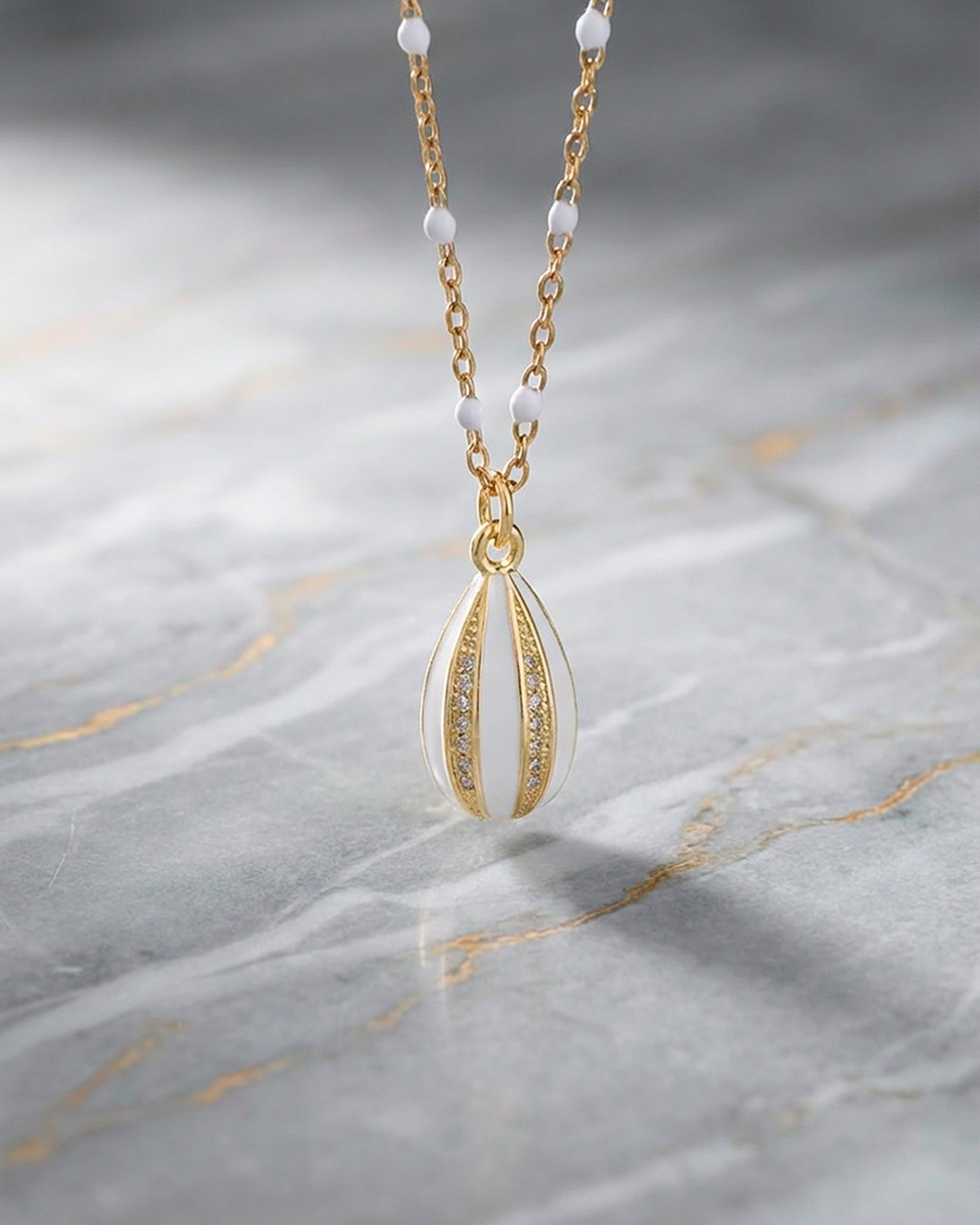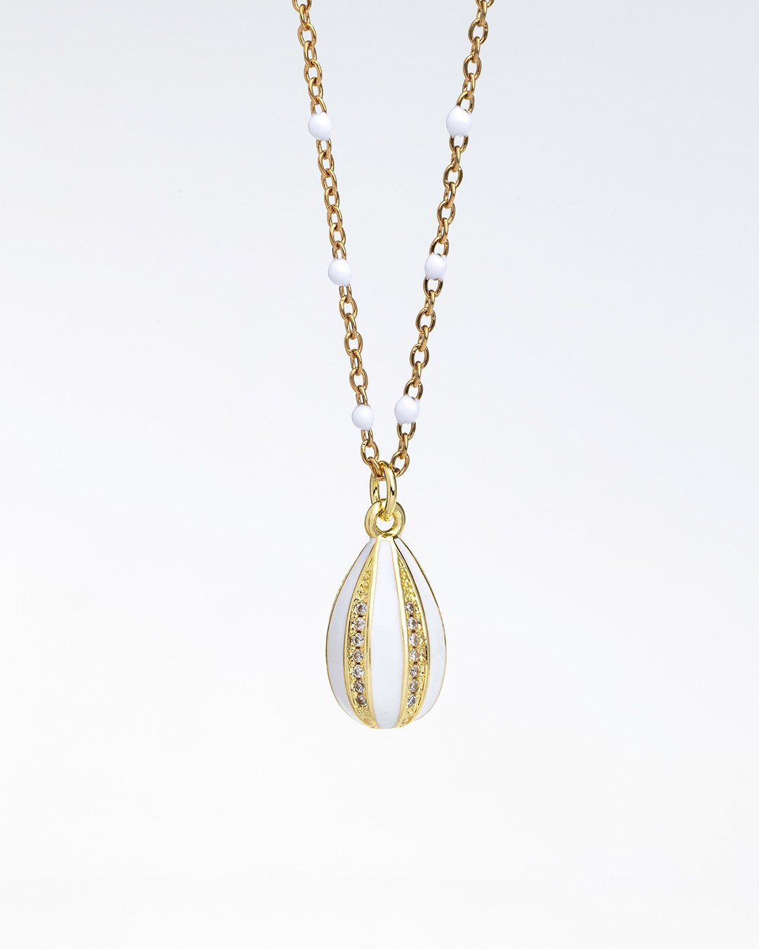 Gold-Plated Egg Necklace with White and Gold Enamel and White Stones