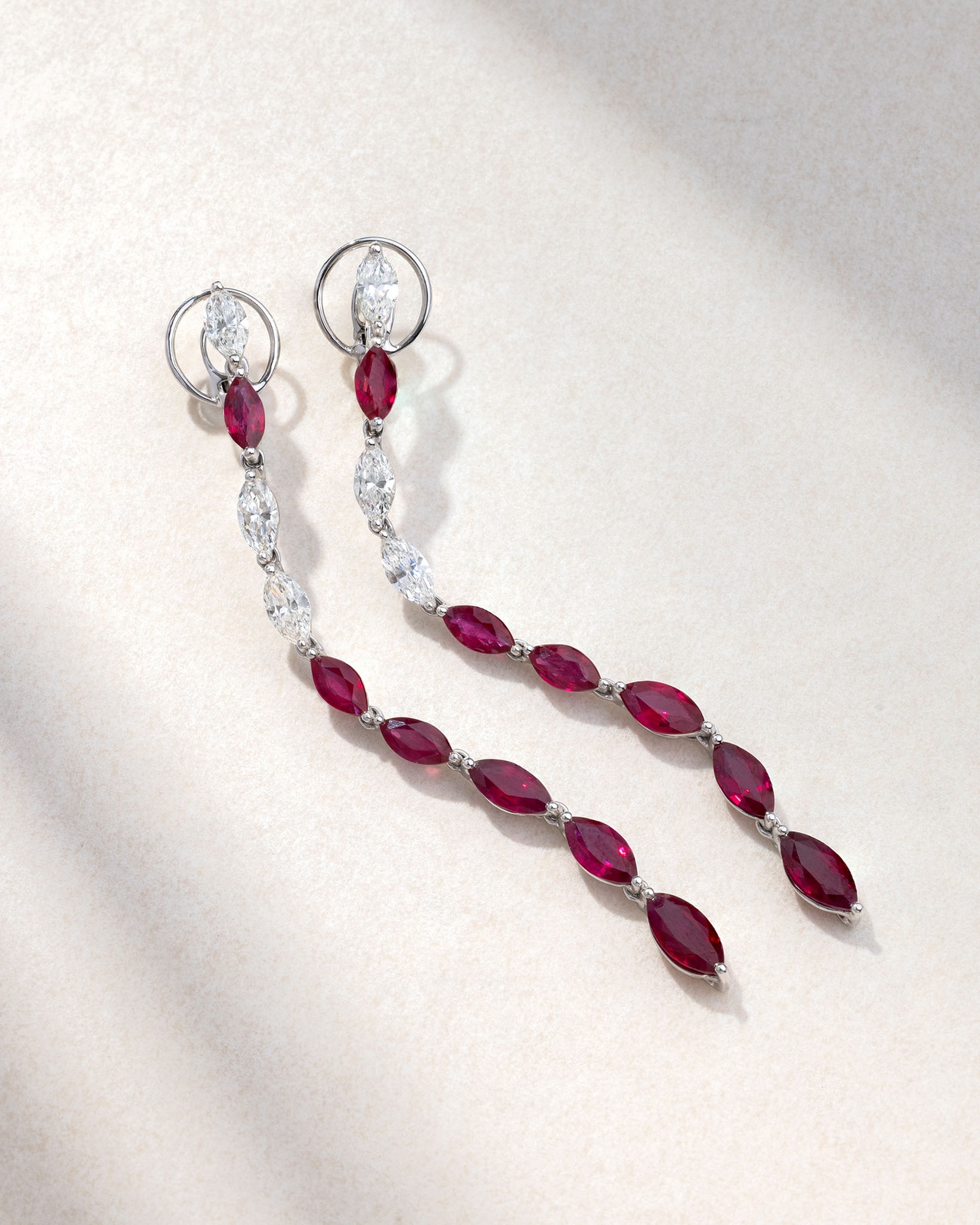 An impressive pair of long earrings in 18K white gold, featuring marquise-cut diamonds and marquise-cut rubies. The dynamic navette cut enhances the intensity of the stones, creating a refined, radiant design with fluidity and timeless femininity. Dare to wear them for evening occasions to elevate your look, or pair them with minimal jewelry for a balanced, high-end effect.