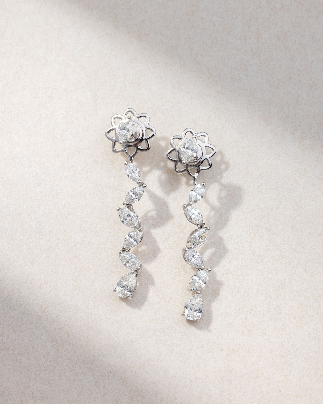 Refined, handmade long earrings crafted in 18K white gold, adorned with Pear and Marquise-cut diamonds that bring a unique brilliance and harmony to the design. With a contemporary design signature and timeless character, they exude elegance and sophistication in every movement. Dare to style them with a minimal look for effortless luxury.
