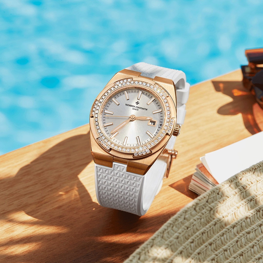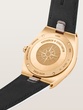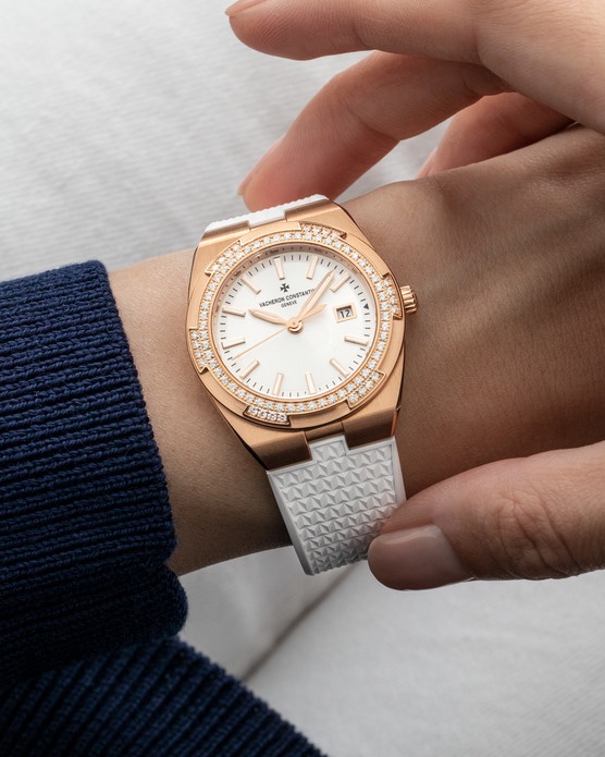 This 18K 5N pink gold watch combines femininity, delicacy, and sporty allure. The 6-sided bezel, which recalls the Maltese cross, is adorned with 78 brilliant-cut diamonds. Its small, 33-millimeter case houses a quartz movement displaying the hours, minutes, seconds, and date. Thanks to its clasp and system of two easily interchangeable straps – leather and rubber – the watch can be personalized according to the owner’s wishes.