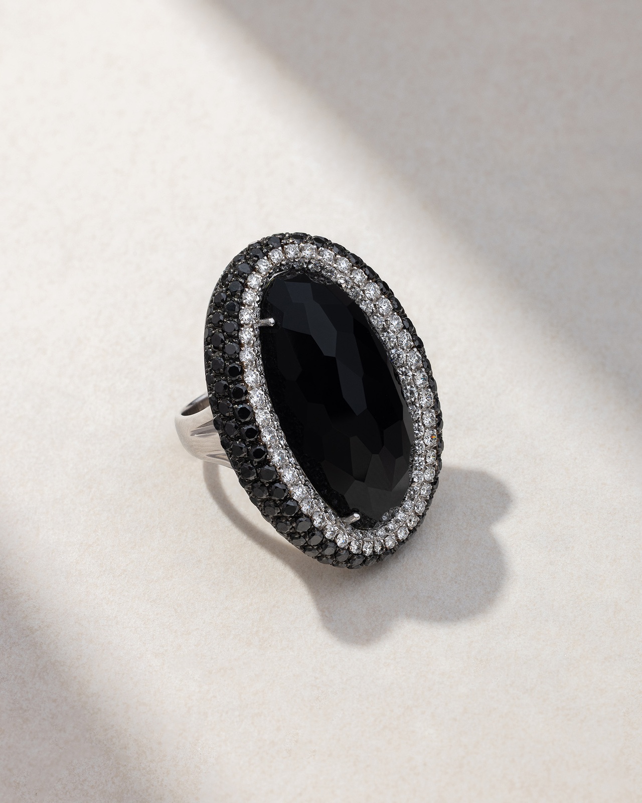 Ring in 18K White Gold with White & Black Brilliant-Cut Diamonds and an Oval Onyx Center