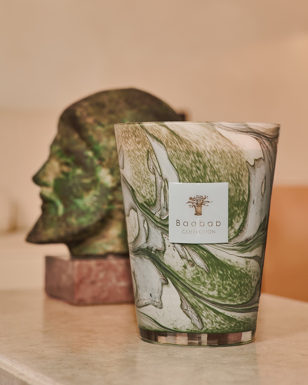 In hand-blown glass of sky blue and celadon green, the Marius scented candle reveals swirling patterns that illuminate beneath the flame like light filtering through Provençal olive groves.