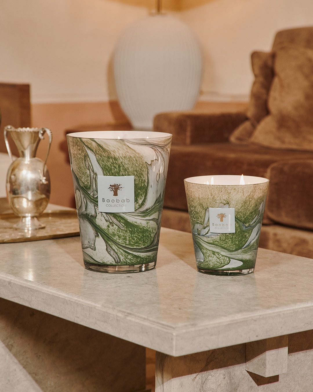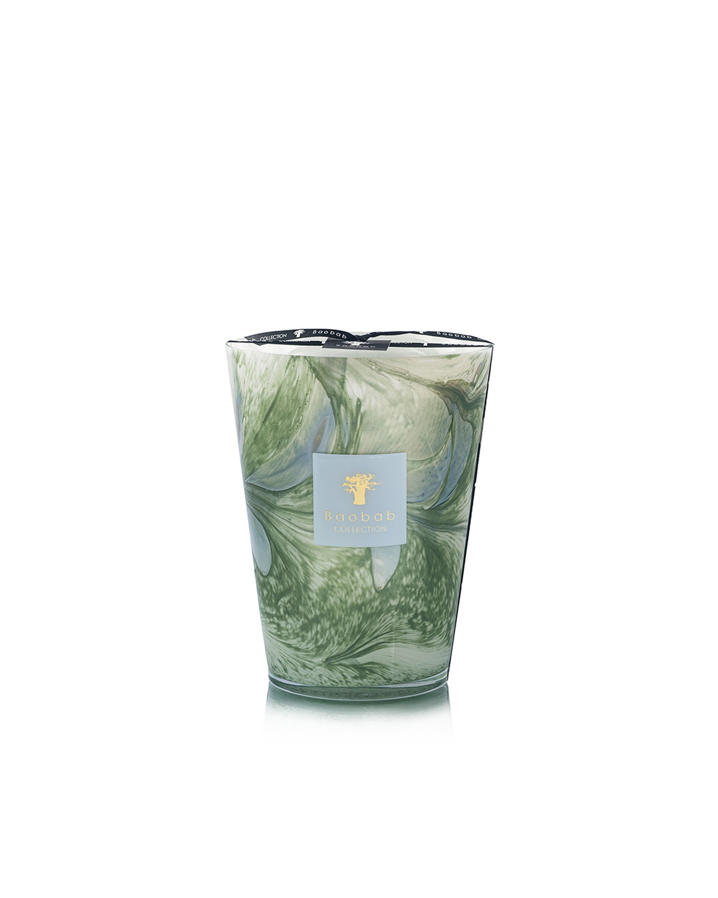 In hand-blown glass of sky blue and celadon green, the Marius scented candle reveals swirling patterns that illuminate beneath the flame like light filtering through Provençal olive groves.
