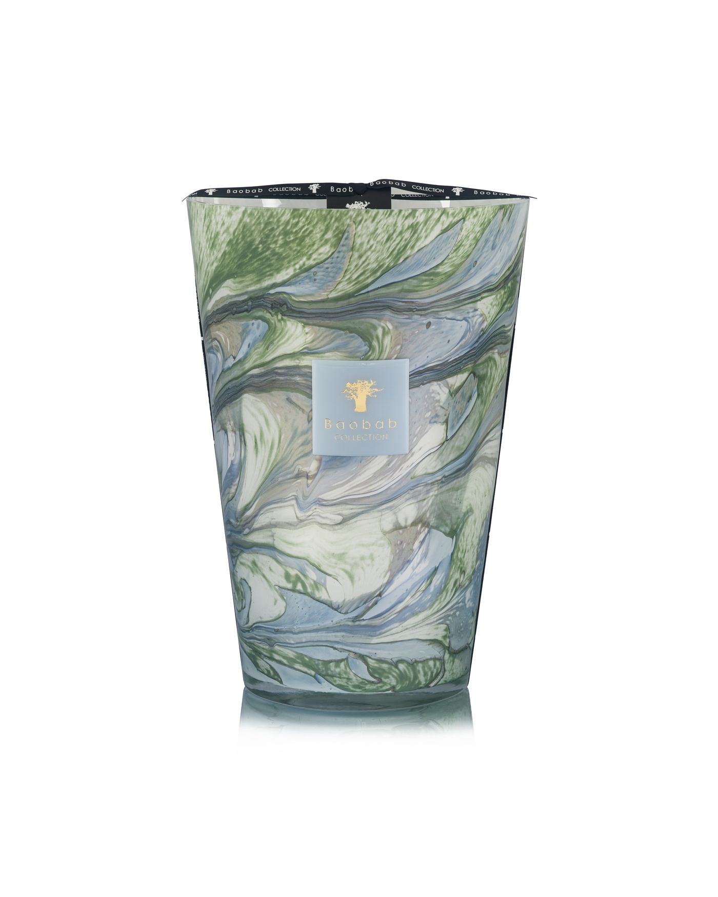 In hand-blown glass of sky blue and celadon green, the Marius scented candle reveals swirling patterns that illuminate beneath the flame like light filtering through Provençal olive groves.