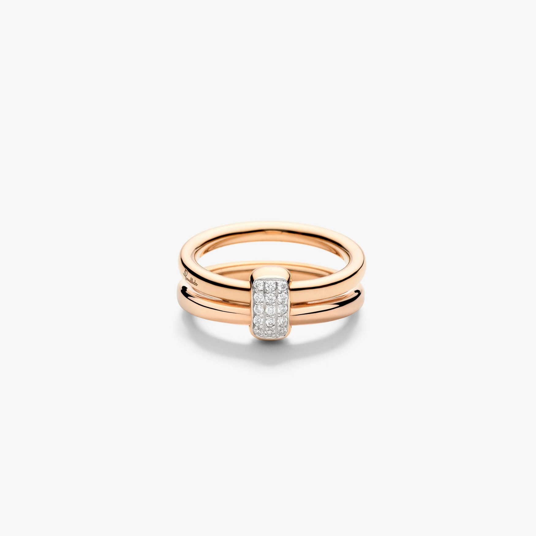 Deeply symbolic, the Pomellato Together collection captures the connections that bind us together, celebrating love in its many forms. The Pomellato Together jewels feature two ellipses held together by a link, symbolizing the power of unity and the strength of togertherness. This rose gold ring set with white diamonds can be worn either revealing or concealing the diamonds link. The perfect Milanese tribute to love.