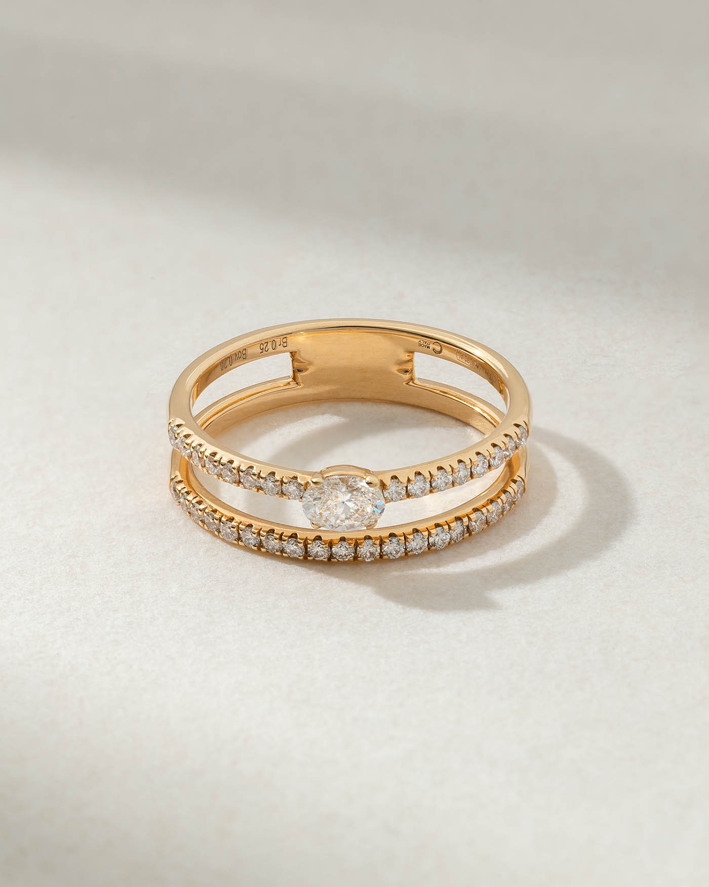 Οι δύο μπριγιαντένιες βέρες αφήνουν το οβάλ διαμάντι να πρωταγωνιστήσει, σε αυτό το υπέρκομψο αφαιρετικό δαχτυλίδι. Φανταστικό στο μεσαίο δάχτυλο ή στον δείκτη, σας συνοδεύει σε κάθε έξοδο.