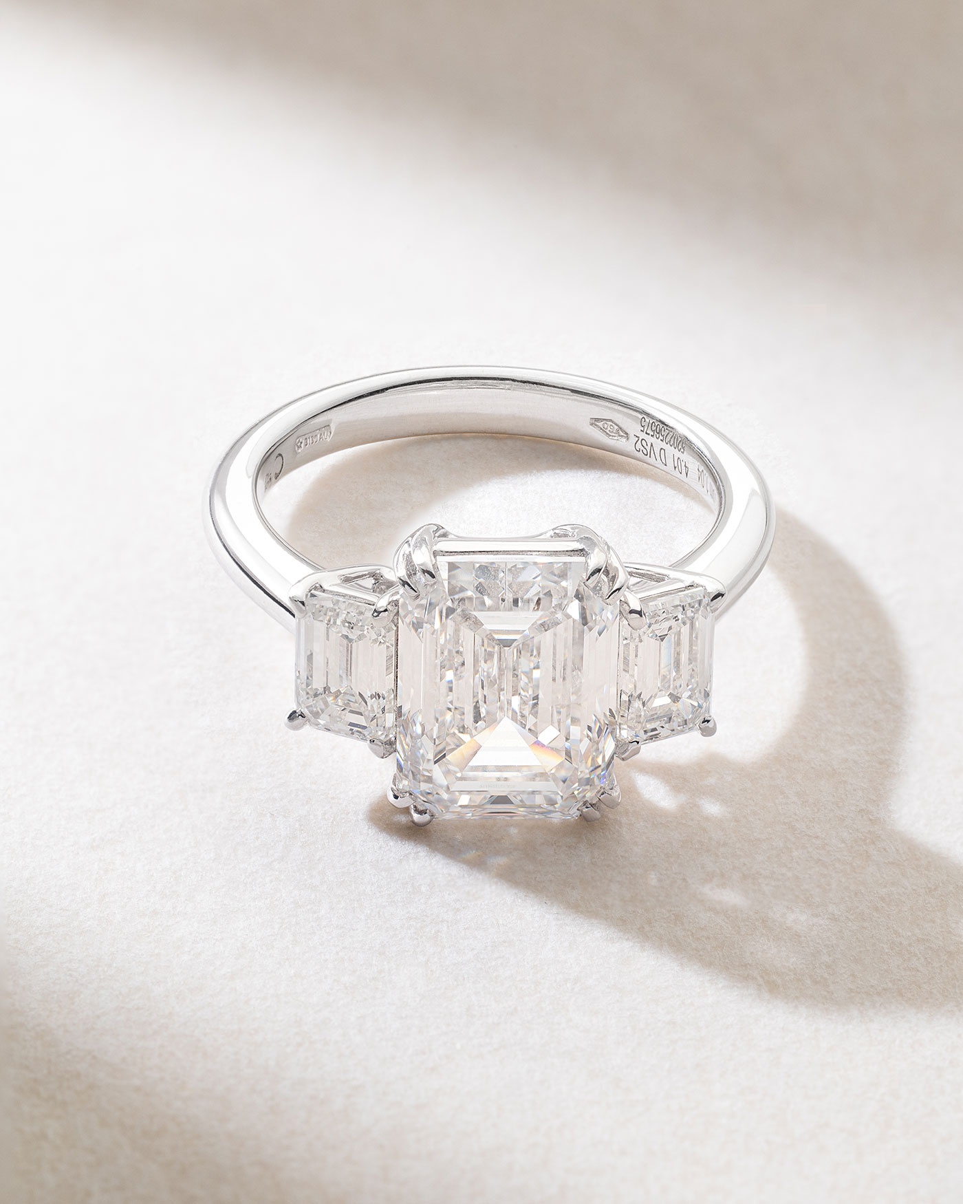 Μοναδικός θησαυρός, αυτό το τρίπετρο δαχτυλίδι προτάσσει τρία σπάνια διαμάντια κοπής emerald με το κεντρικό να έχει μέγεθος 4,01 καράτια και D χρώμα. Ένα κόσμημα άξιο να επισφραγίσει μία ξεχωριστή στιγμή.