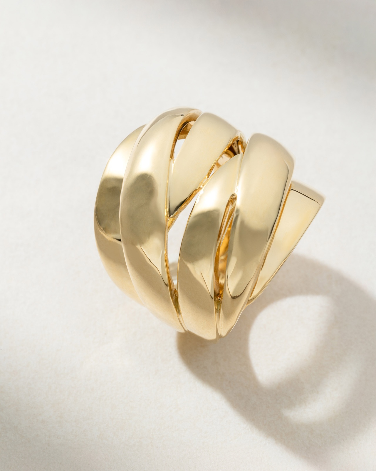 Ευκολοφόρετο και τολμηρό, αυτό το ογκώδες χειροποίητο δαχτυλίδι από τον Οίκο Damaso είναι χειροποίητο από κίτρινο χρυσό 18 καρατίων., Συνδυάστε το με μεγάλους χρυσούς κρίκους και μακριές αλυσίδες για ένα επιβλητικό αποτέλεσμα.