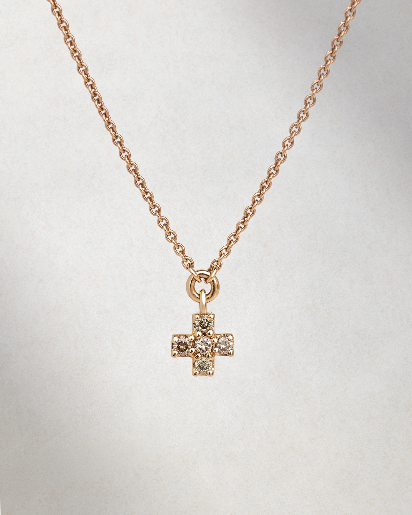 Μοντέρνος σταυρός από 18Κ ροζ χρυσό, διακοσμημένος με καφέ μπριγιάν διαμάντια που προσθέτουν ζεστή λάμψη και διακριτική πολυτέλεια. Ο ιδιαίτερος χαρακτήρας του σχεδιασμού αναδεικνύει τη διαχρονική μορφή του σταυρού με μια εκλεπτυσμένη και σύγχρονη αισθητική. Ιδανικός για να φορεθεί μόνος του ως statement κόσμημα ή να συνδυαστεί με γήινους τόνους για ένα ζεστό και sophisticated αποτέλεσμα.