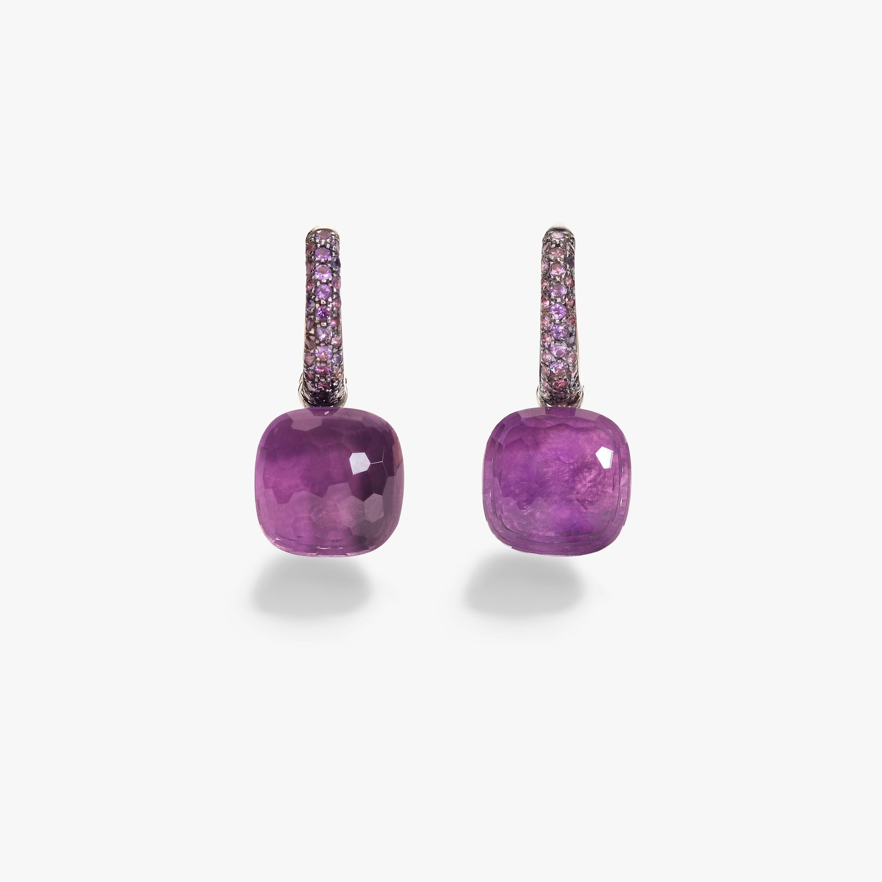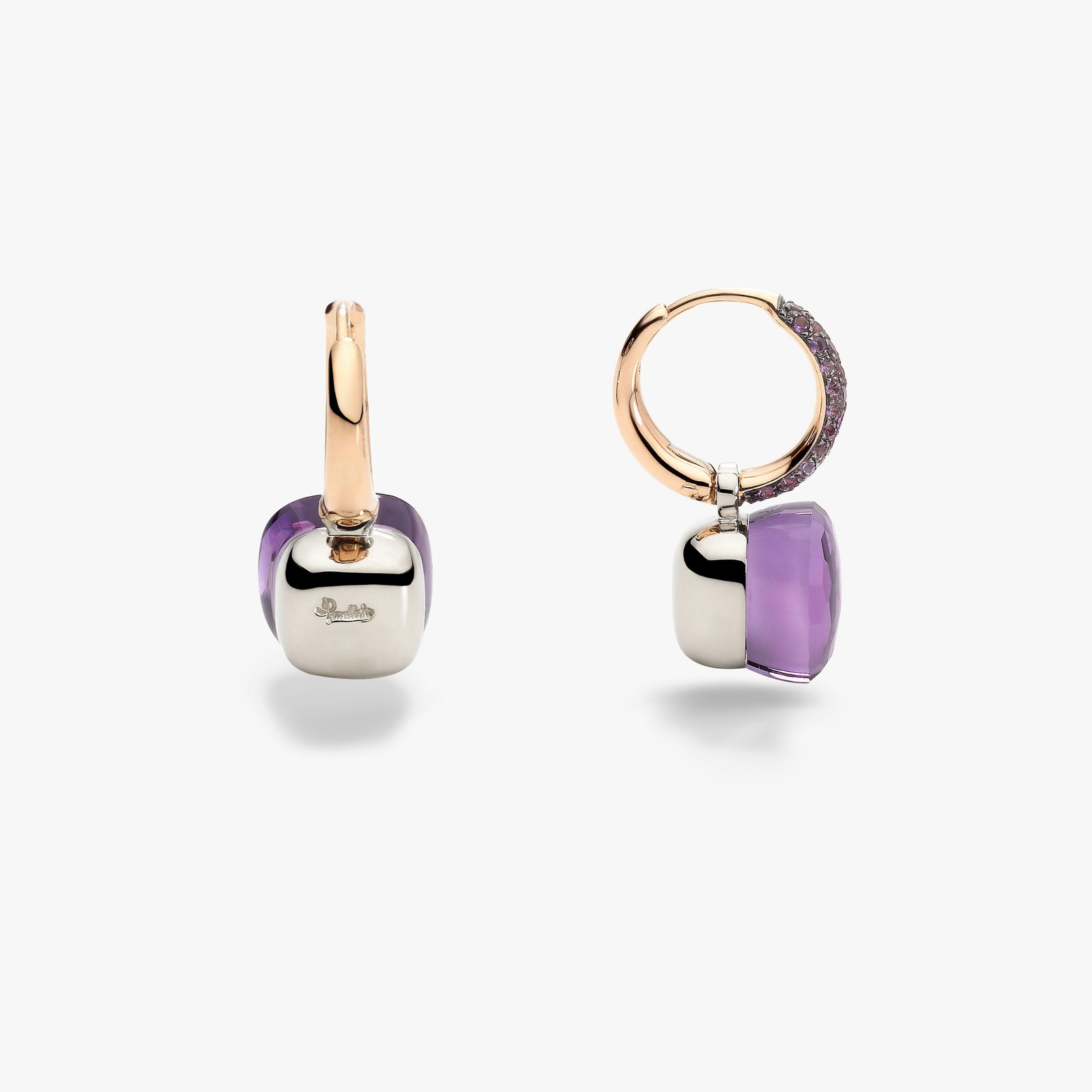 Η Nudo παραμένει η best selling συλλογή της Pomellato με τη χαρακτηριστική πληθώρα έντονων χρωμάτων. Τα σκουλαρίκια με τους αμέθυστους και το jade συνδυάζουν αριστουργηματικά διάφανους με συμπαγείς πολύτιμους λίθους