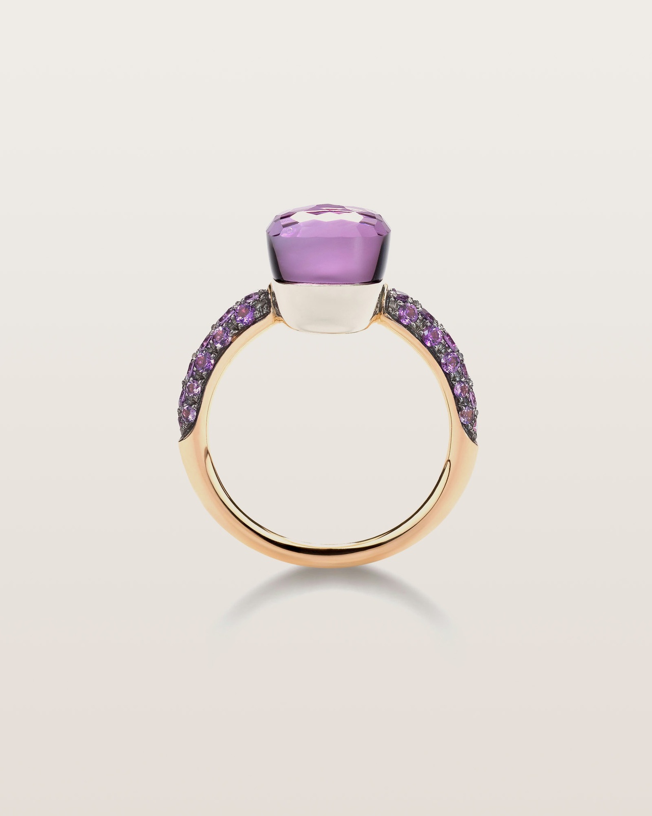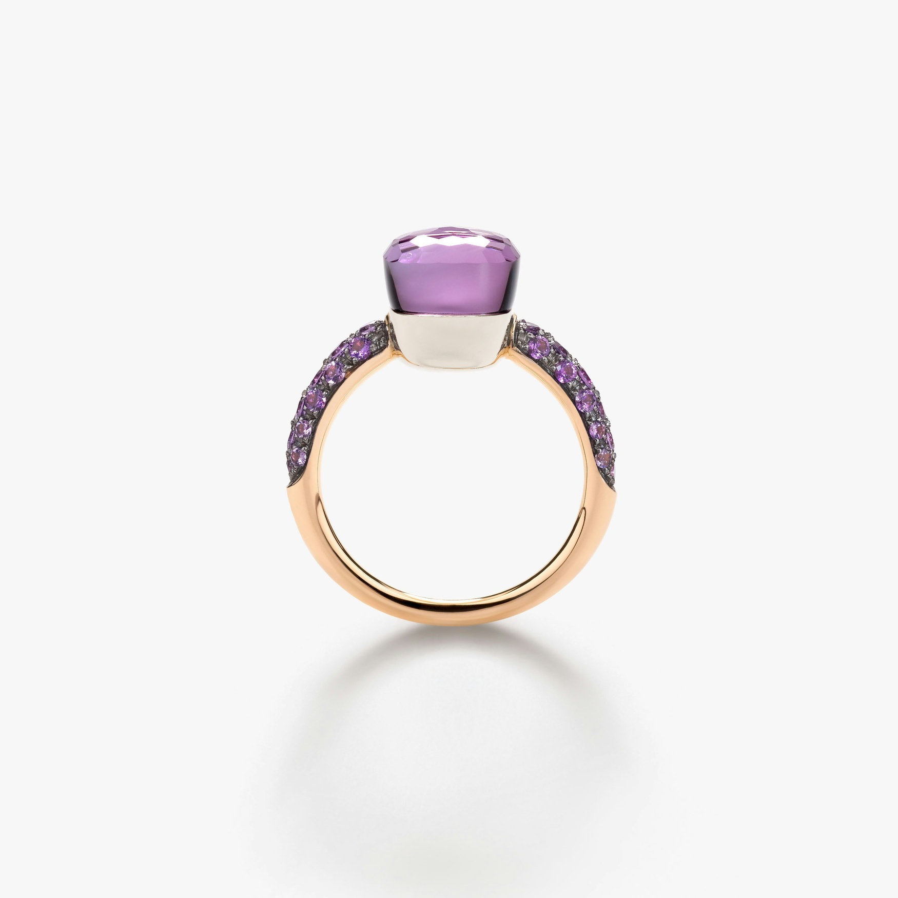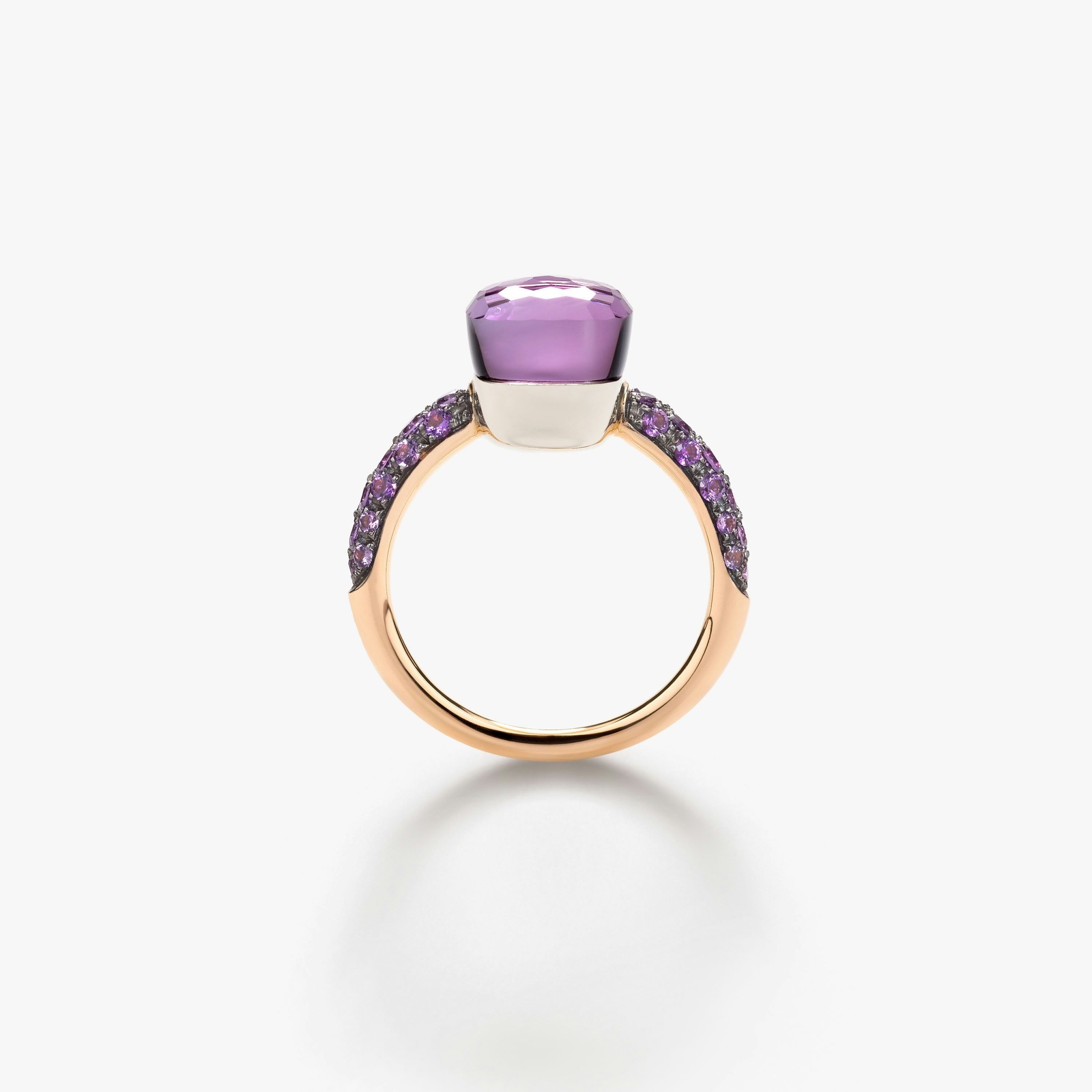 Η Nudo συνεχίζει να είναι η αντιπροσωπευτική σειρά της Pomellato και να συναρπάζει με τα εκθαμβωτικά χρώματα της. Σε αυτό το Nudo δαχτυλίδι ο αμέθυστος ενώνεται με το jade σε ένα μαγευτικό συνδυασμό πλαισιωμένο από παβέ μικρότερους αμέθυστους