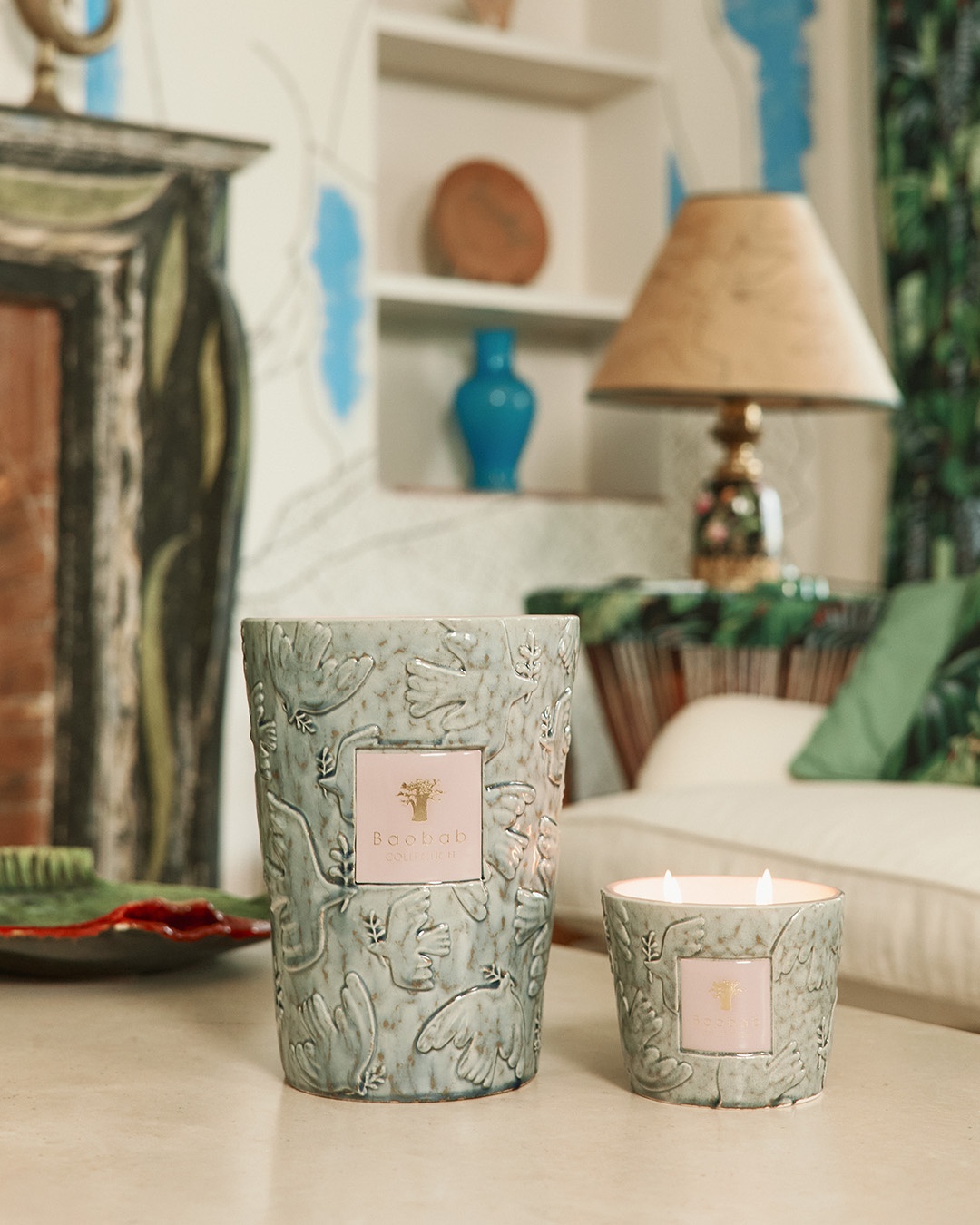 Το αρωματικό κερί Colombe είναι φτιαγμένο από σελαντόν πράσινη κεραμική με διακριτικές, πατιναρισμένες αντανακλάσεις, ενώ τα ανάγλυφα περιστέρια που αναδύονται από την επιφάνειά του θυμίζουν αρχαίο ανάγλυφο. Το απαλό ροζ εσωτερικό σμάλτο δημιουργεί μια φωτεινή λάμψη που παραπέμπει στην παραδοσιακή μεσογειακή κεραμική.