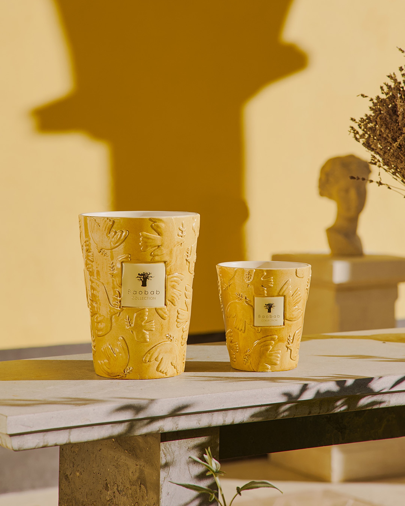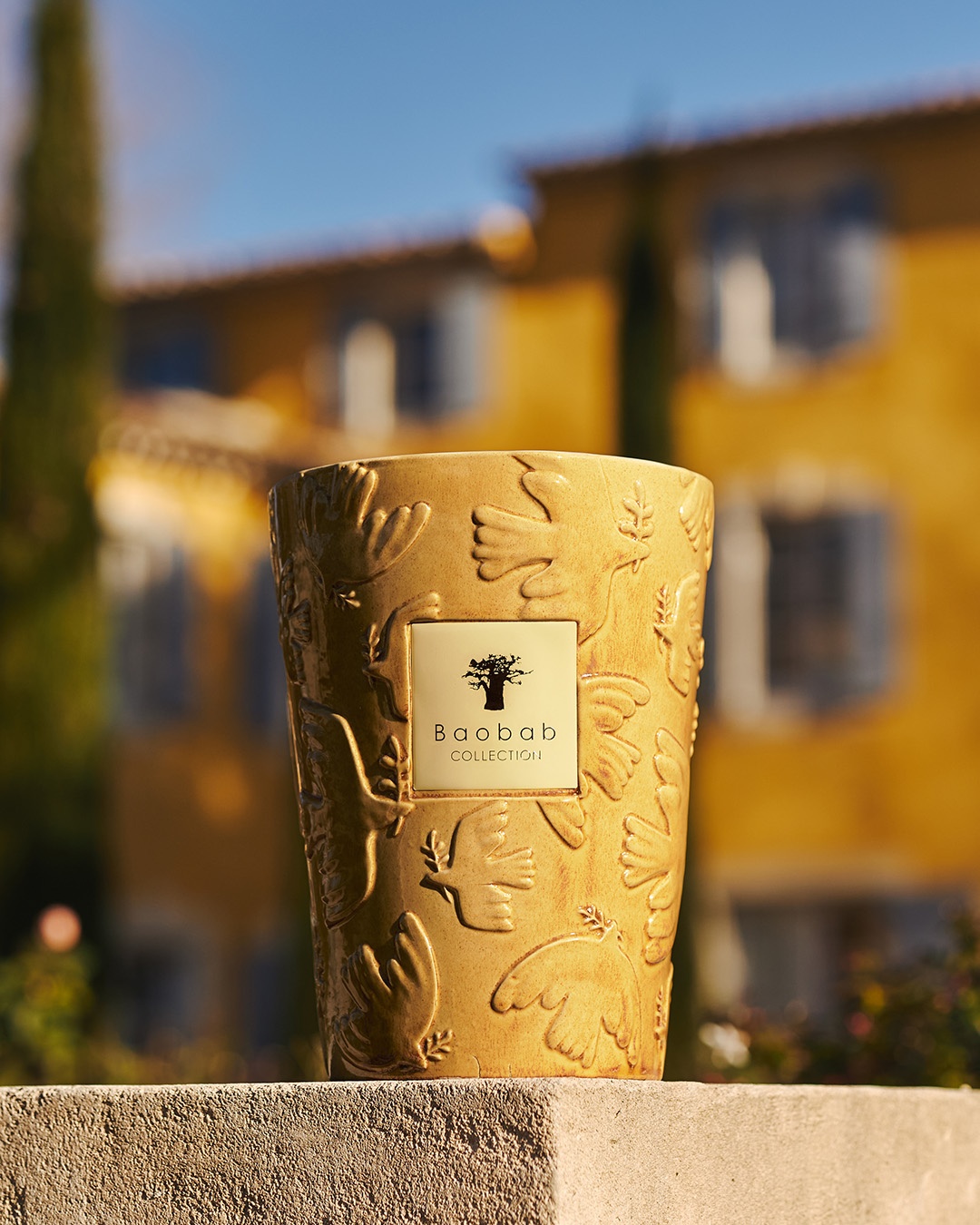 Το αρωματικό κερί Dove ακτινοβολεί μέσα από ένα ζωντανό κίτρινο σμάλτο, λουσμένο στο φως του ήλιου, όπου τα ανάγλυφα περιστέρια μοιάζουν να αιωρούνται πάνω σε κεραμική επιφάνεια ζεσταμένη από το μεσογειακό φως.