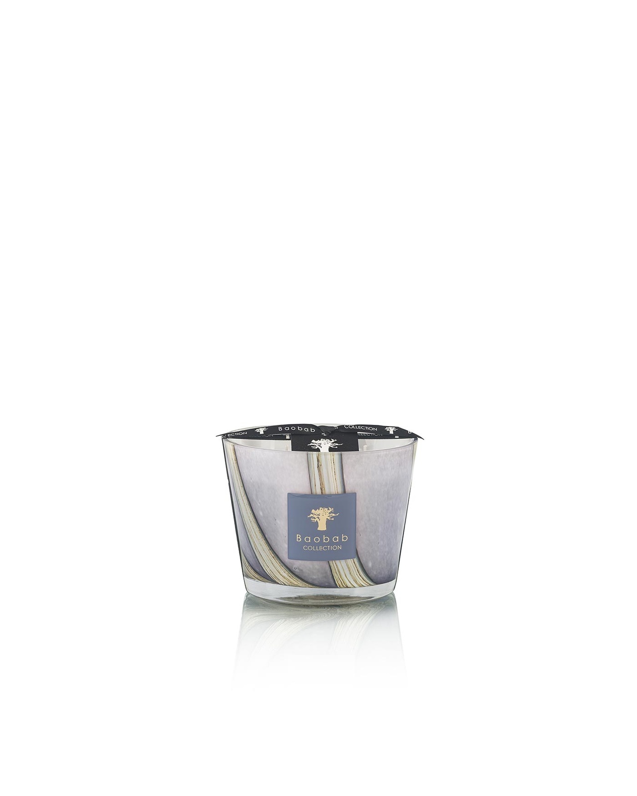 Το γυαλί του αρωματικού κεριού Brocéliande, με τις κάθετες γραμμές του που παραπέμπουν σε δάσος, ταλαντεύεται διακριτικά ανάμεσα στο γκρι και τη λεβάντα, αποκαλύπτοντας μια αίσθηση εκλεπτυσμένης κομψότητας.
