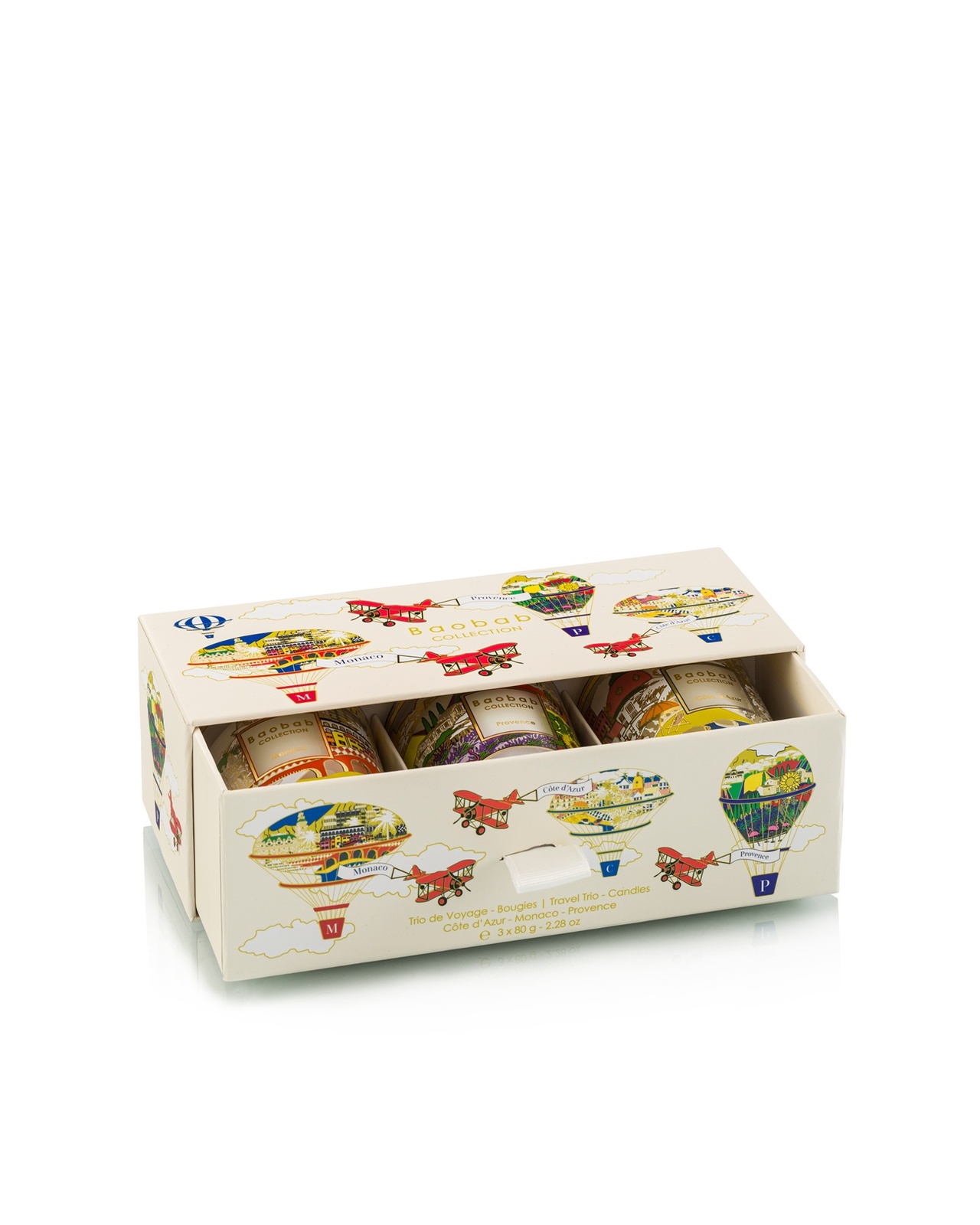 Το σετ δώρου «Cap vers le sud» συγκεντρώνει τρία μίνι κεριά, εμπνευσμένα σαν στάσεις σε ένα ταξίδι κατά μήκος της Μεσογειακής ακτής ή στην εξοχή της Προβηγκίας. Παρουσιασμένο σε ένα κουτί διακοσμημένο με πολύχρωμα αερόστατα, κάθε κερί εικονογραφείται ανάλογα με τον προορισμό του, μετατρέποντας αυτό το τρίο σε ένα πραγματικό συλλεκτικό αντικείμενο που μπορεί να προσφερθεί ως δώρο ή να κρατηθεί ως καλοκαιρινό ενθύμιο.