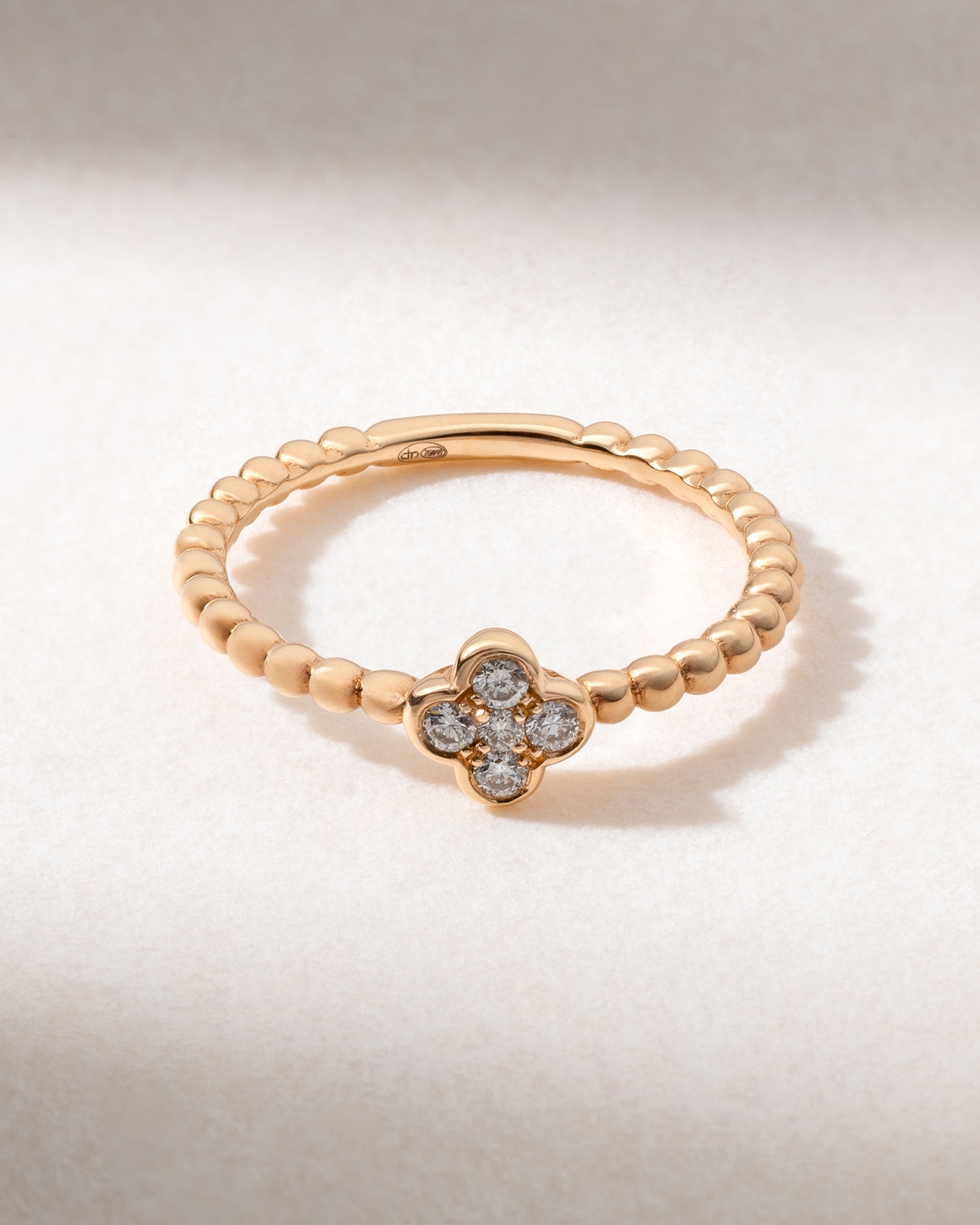 Simplicity and elegance are the two words that capture the essence of Damaso’s cross ring. Hand-crafted from rose gold, the band is a set of golden dots with a cross-like setting in the center, show-casing a set of brilliant cut diamonds. Perfect as a gift to commemorate special occasions.