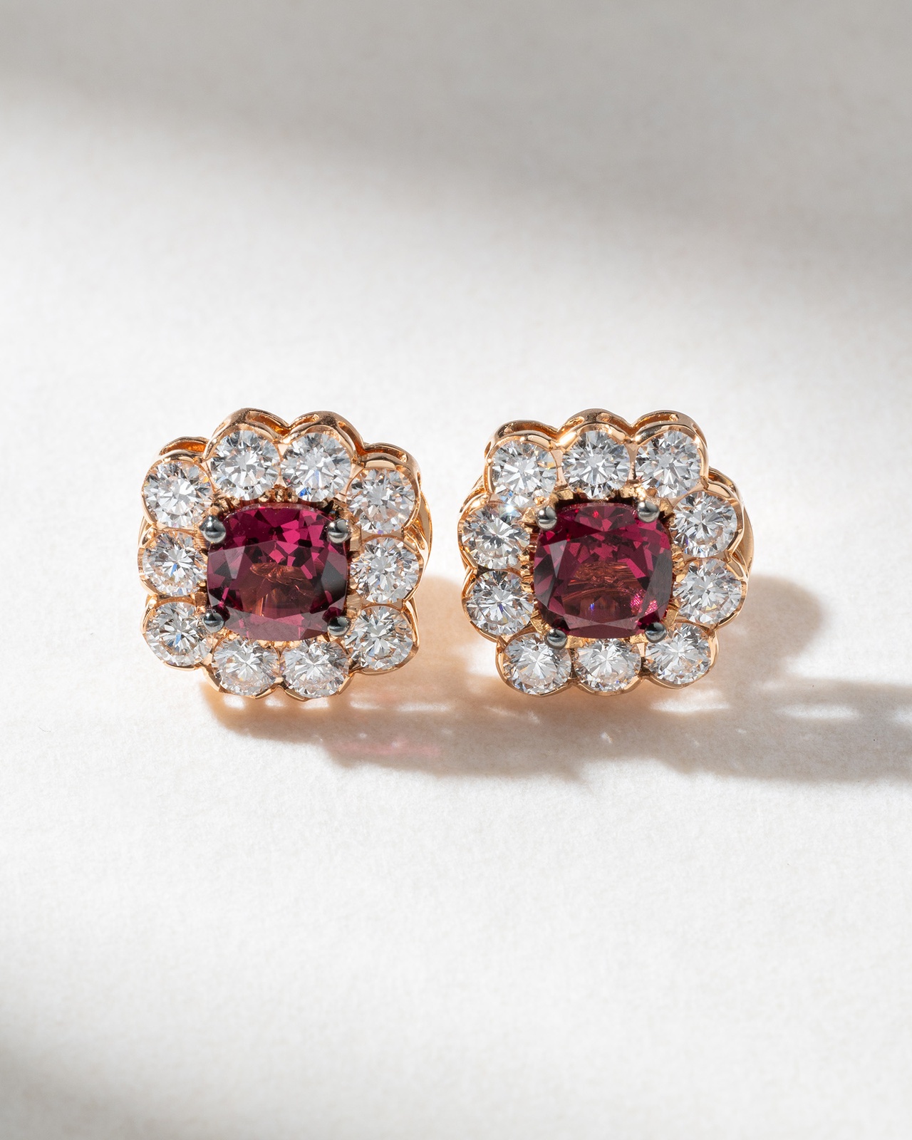 Chic and feminine, this pair of studs will give allure to all your cocktail looks. Set with stunning burgundy rodolites and gleaming diamonds they are meticulously crafted from 18K rose gold.