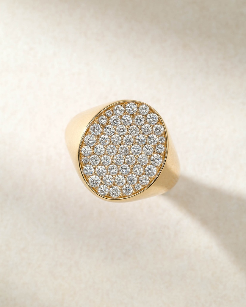 This bulky rose gold ring, is mounted with 51 brilliant cut diamonds on an impressive pave setting. Wearable either on your pinky or your ring finger, this chic piece adds elegance to all your looks.