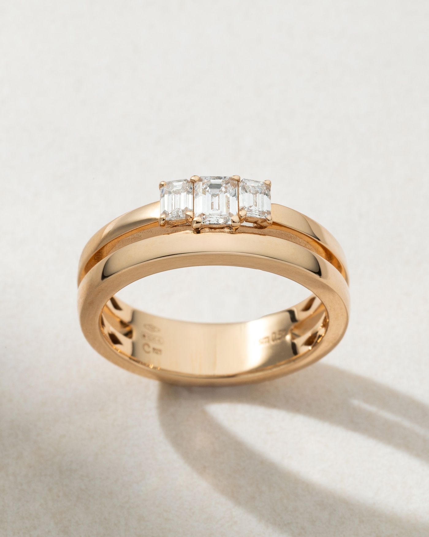 18K Rose Gold Ring with Double Band and Three Emerald cut Diamonds