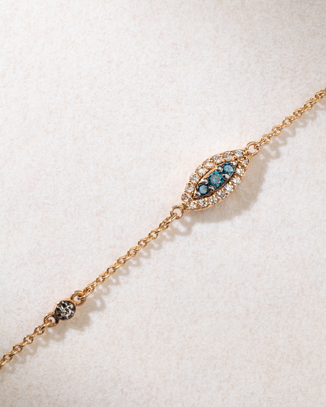 The most elegant Talisman bracelet, handmade from 18 karat rose gold, it is centered with a miniature lucky eye encrusted with white and blue brilliant diamonds. Stuck it with your other favorites on an everyday basis.