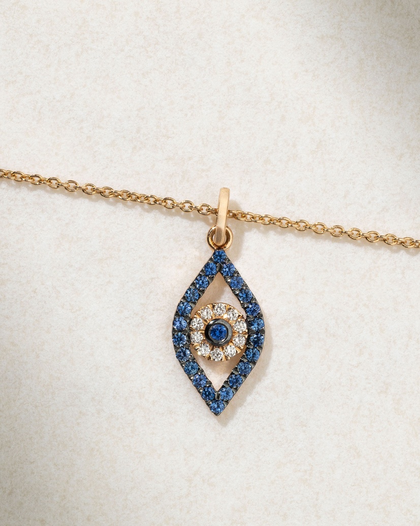 An ancient symbol that protects and guards you, this talisman necklace drops vertically under a subtle mat rose gold chain. The shape of the lucky eye is outlined with blue sapphires while the iris is inlaid with a vibrant central sapphire surrounded by a halo of brilliant cut diamonds.