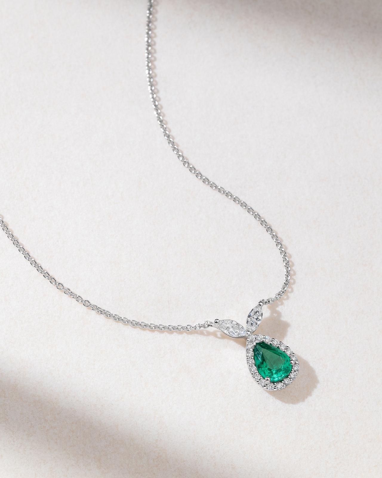 With an exquisite pear shaped sapphire surrounded by brilliants and a sleek white gold chain, this timeless necklace can become a tasteful gift to commemorate a special occasion.