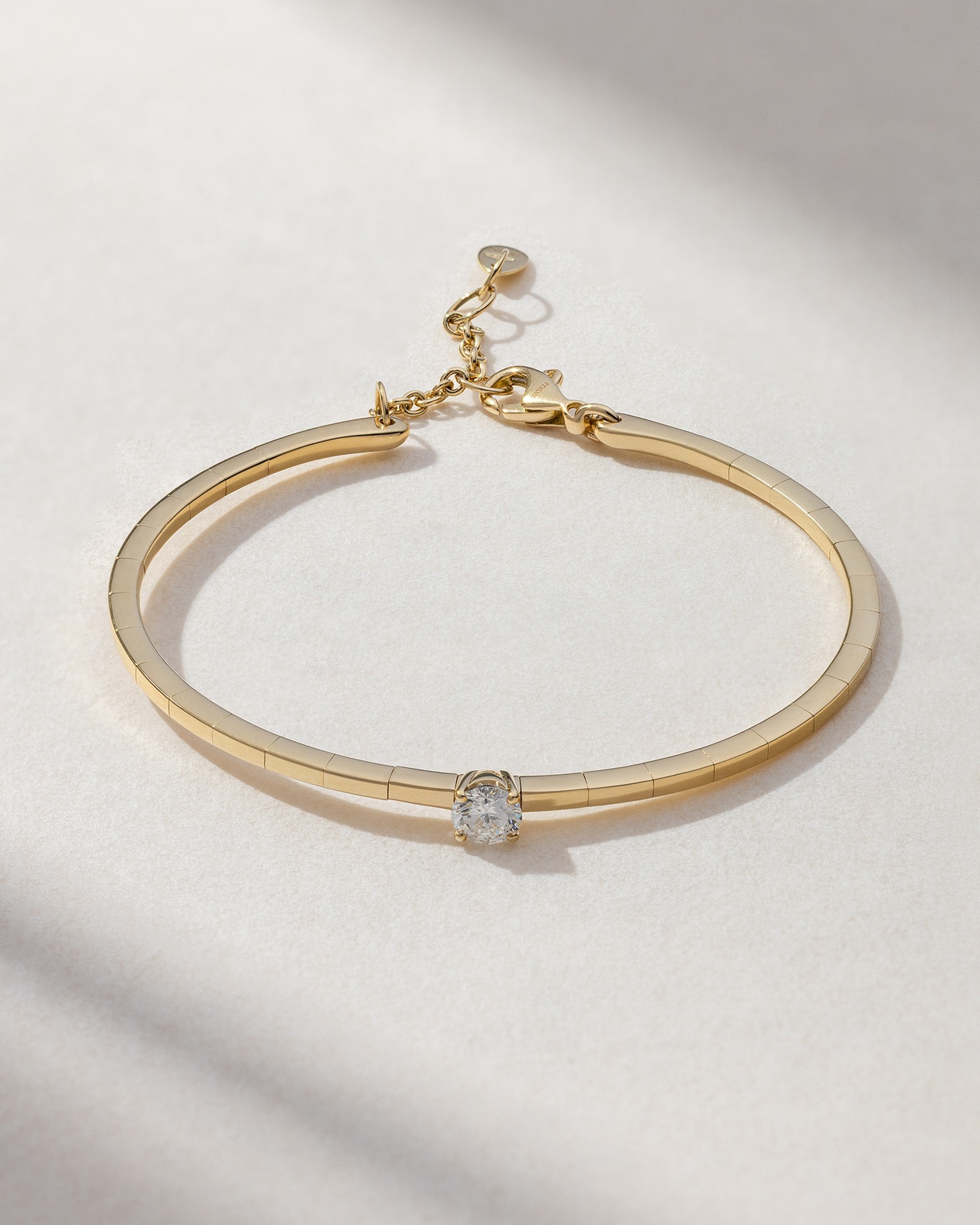 Luminous bracelet crafted from 18K yellow gold, adorned with select high-quality brilliant diamond. Its timeless design balances elegance with understated luxury, enhancing every movement of the wrist with light and refinement. Wear it on its own for a minimal chic effect or combine it with other gold pieces for a more striking, layered look.