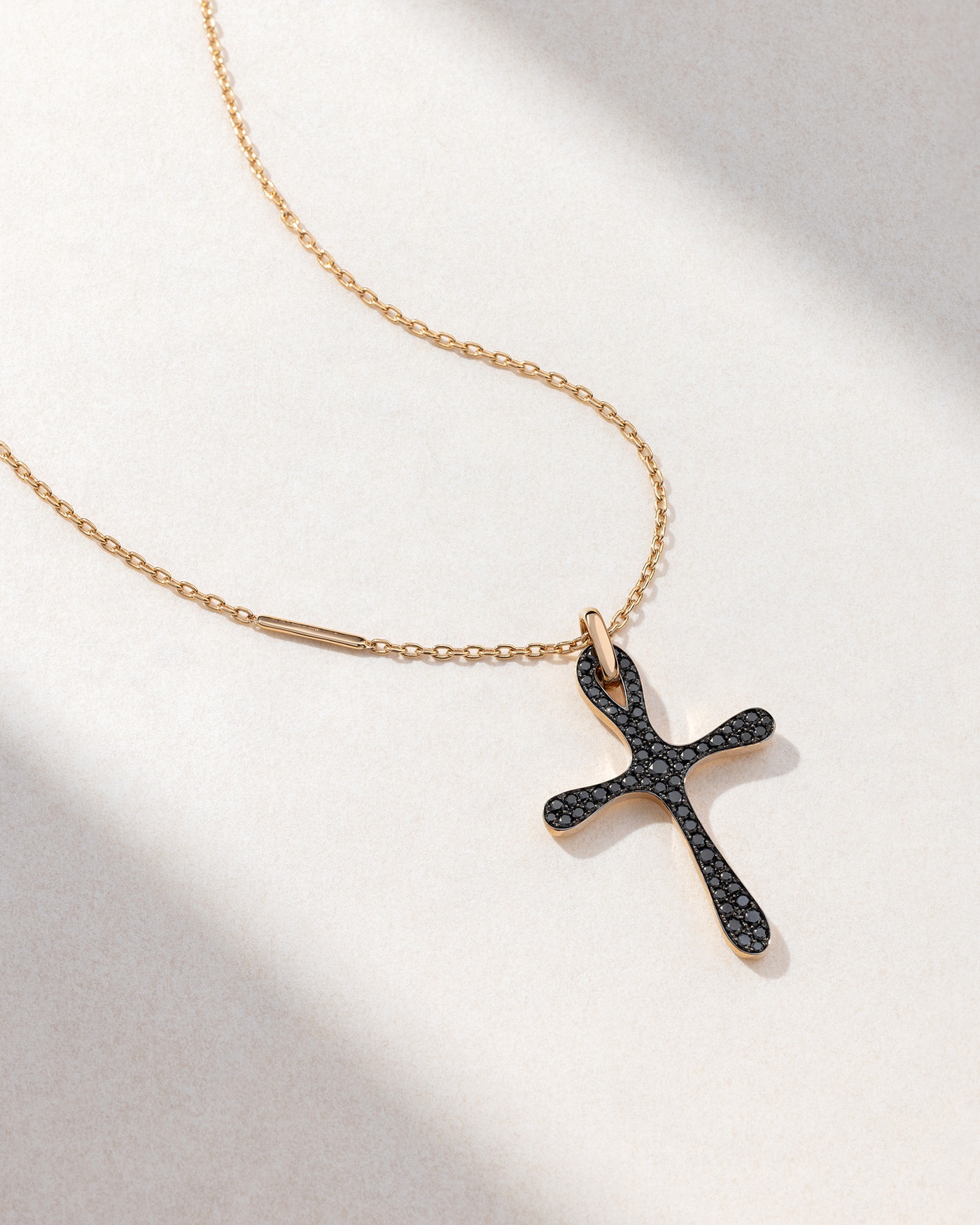 Distinctive cross in 18K rose gold, adorned with black brilliant-cut diamonds that deliver a striking sparkle. With an exceptional design and timeless elegance, it exudes high jewelry craftsmanship. Wear it alone or layered for a modern, chic look.