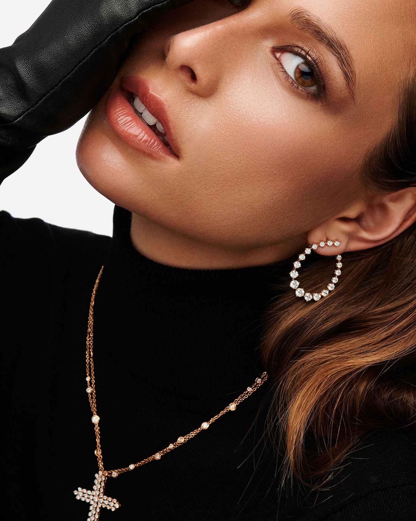 Refined 18K rose gold earrings with brilliant-cut diamonds, offering subtle sparkle and ethereal femininity. Their design exudes modern luxury — a signature of timeless craftsmanship. Pair them with an elegant outfit for effortless sophistication from day to night.