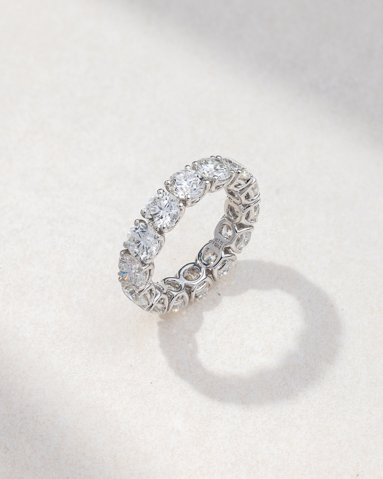 Striking eternity ring in 18K white gold, set with brilliant-cut diamonds. The continuous row of brilliants embraces the finger with refined sparkle, highlighting timeless elegance and the art of contemporary jewelry design. Pair it with a white gold watch or bracelets for a complete, polished look.