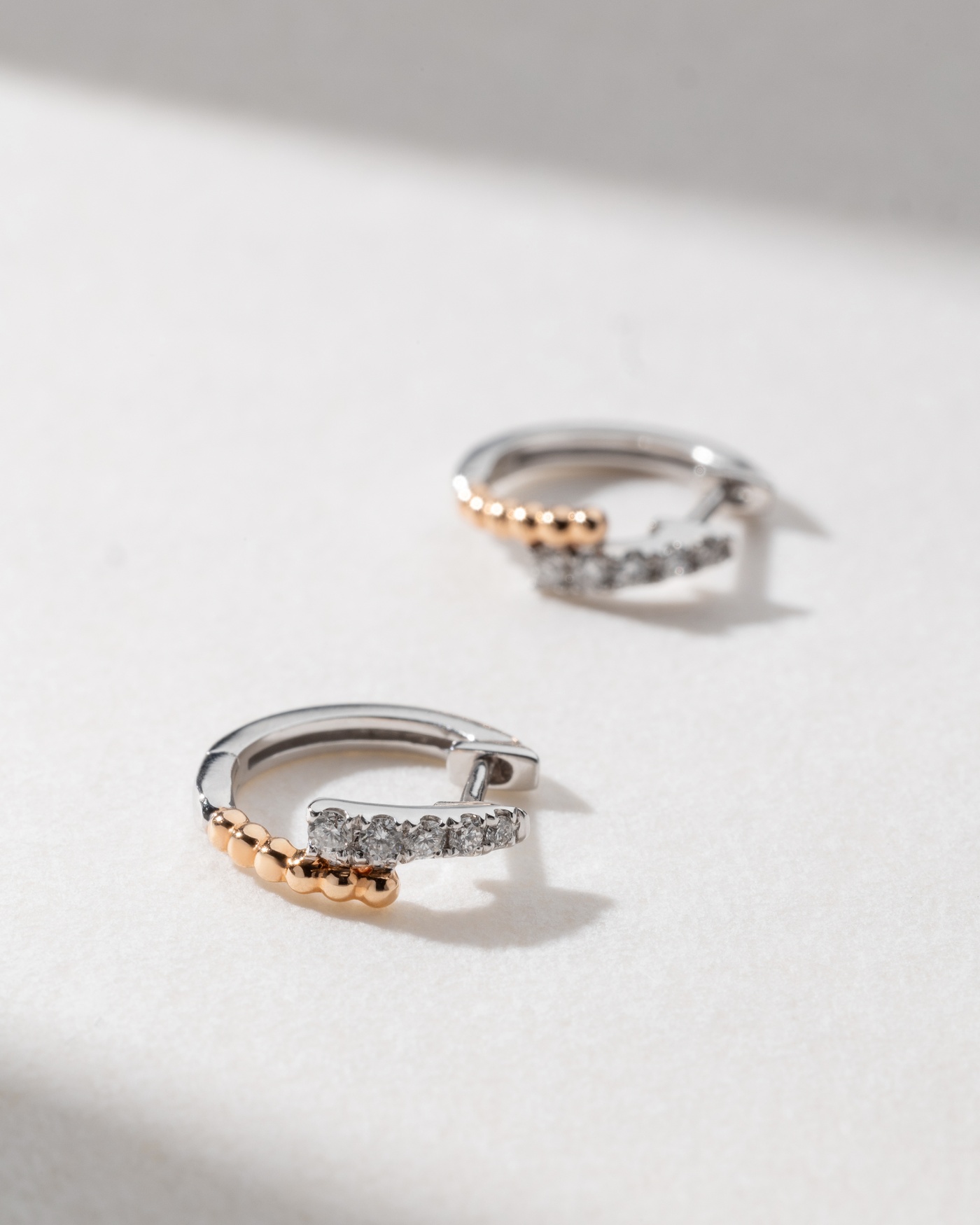 A modern approach to the classic small hoops, this design will become one of your everyday favorites. The combination of the 18 karat rose and white gold, in liaison with the sparkling line of briliants in the middle, makes it a delicate yet luxurious item that should becοme yours!