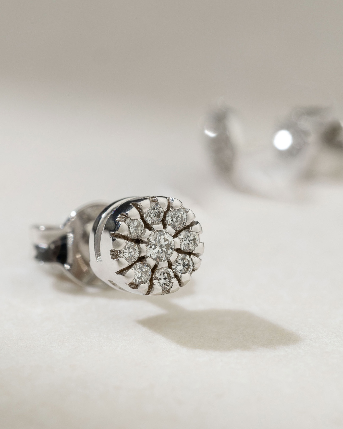 Charming and minimal, these studded earrings will never go out of style. Made of 18K white gold with brilliants encrusted in the center, they will catch the sunlight beautifully as well as the eyes of the people!