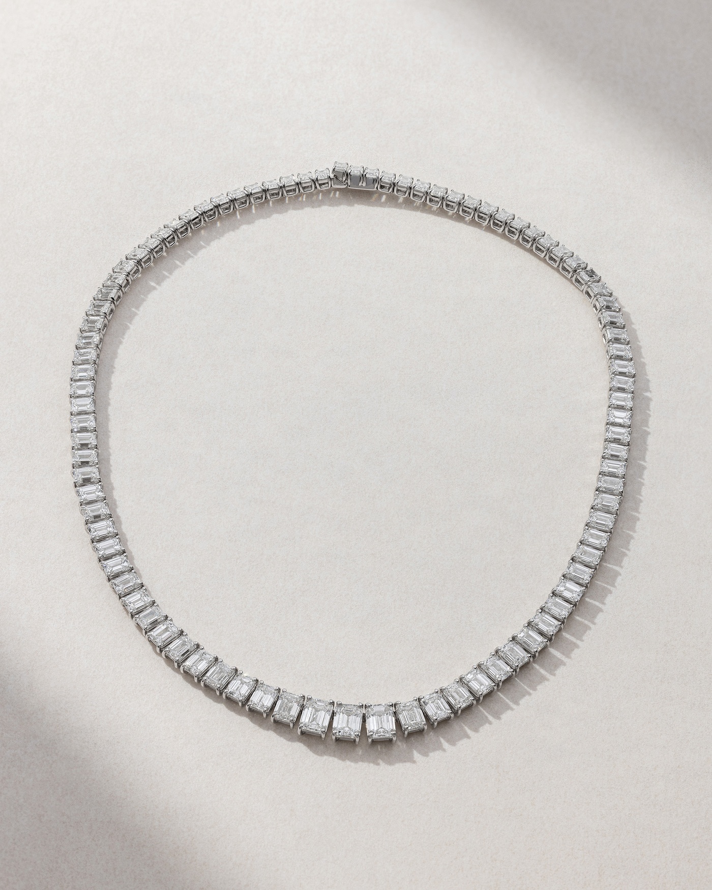 Radiant necklace in 18K white gold with emerald-cut diamonds. A timeless luxury piece where the emerald-cut diamonds reflect light with clean lines and geometric harmony, exuding elegance and refined brilliance. Wear it alone for a striking statement look.