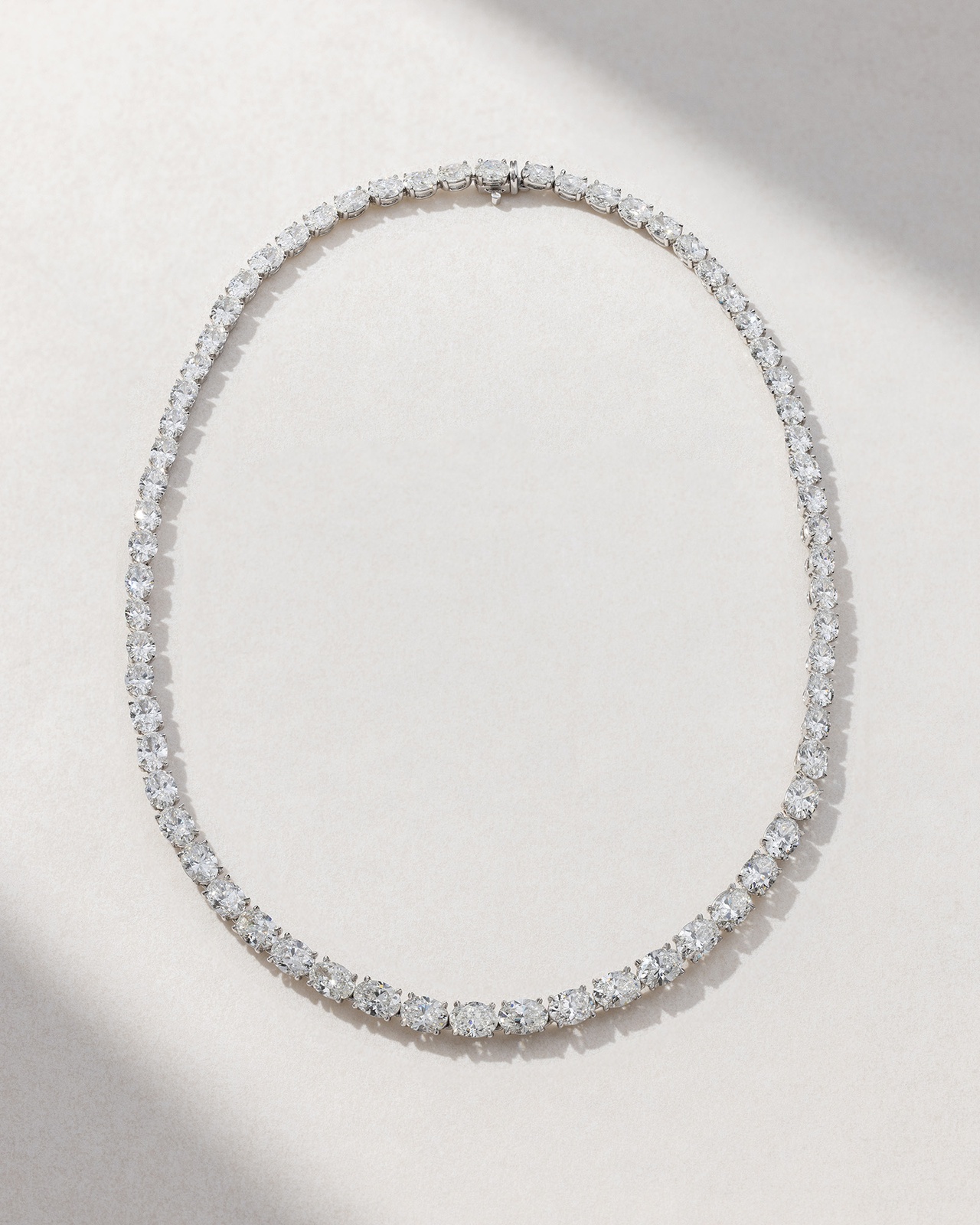 An impressively crafted necklace in 18K white gold, adorned with oval-cut diamonds. The refined lines of its design highlight the brilliance of the diamonds, creating a sense of harmony and timeless elegance. Wear it as the ultimate statement piece, pair it boldly with minimal outfits, or let it take center stage in your formal looks.