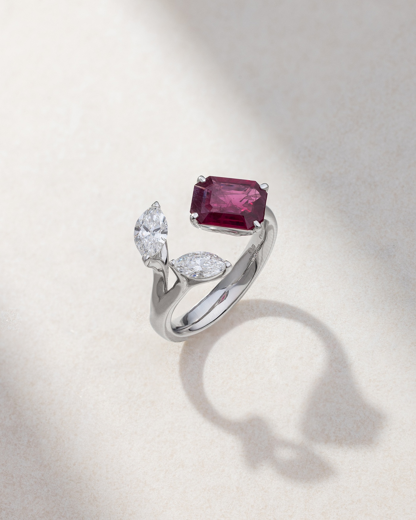 Striking ring in 18K white gold, featuring a navette diamond and an emerald-cut ruby.