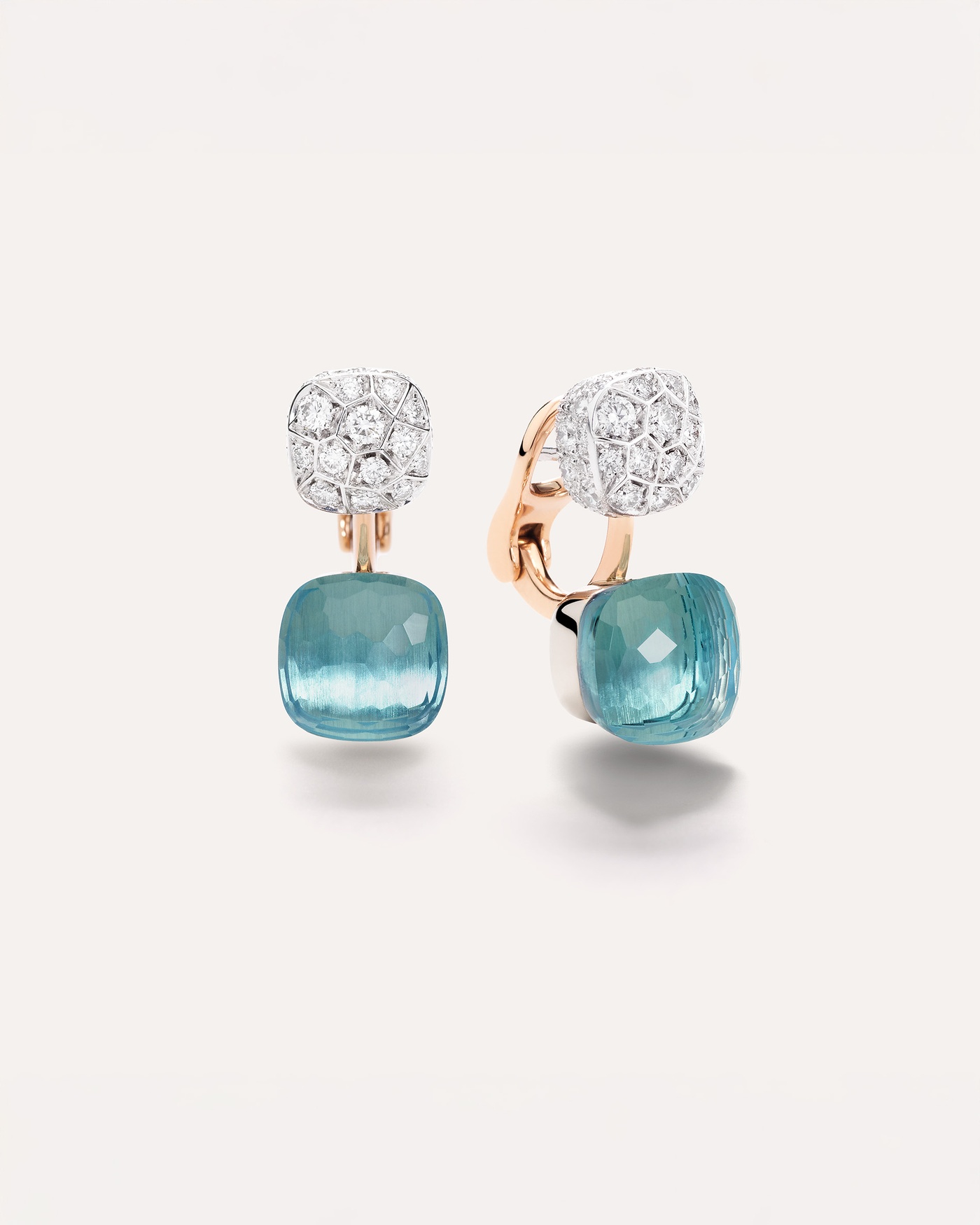 Nudo Earrings in 18k Rose and White gold with 2 sky blue topazes and 76 white diamonds