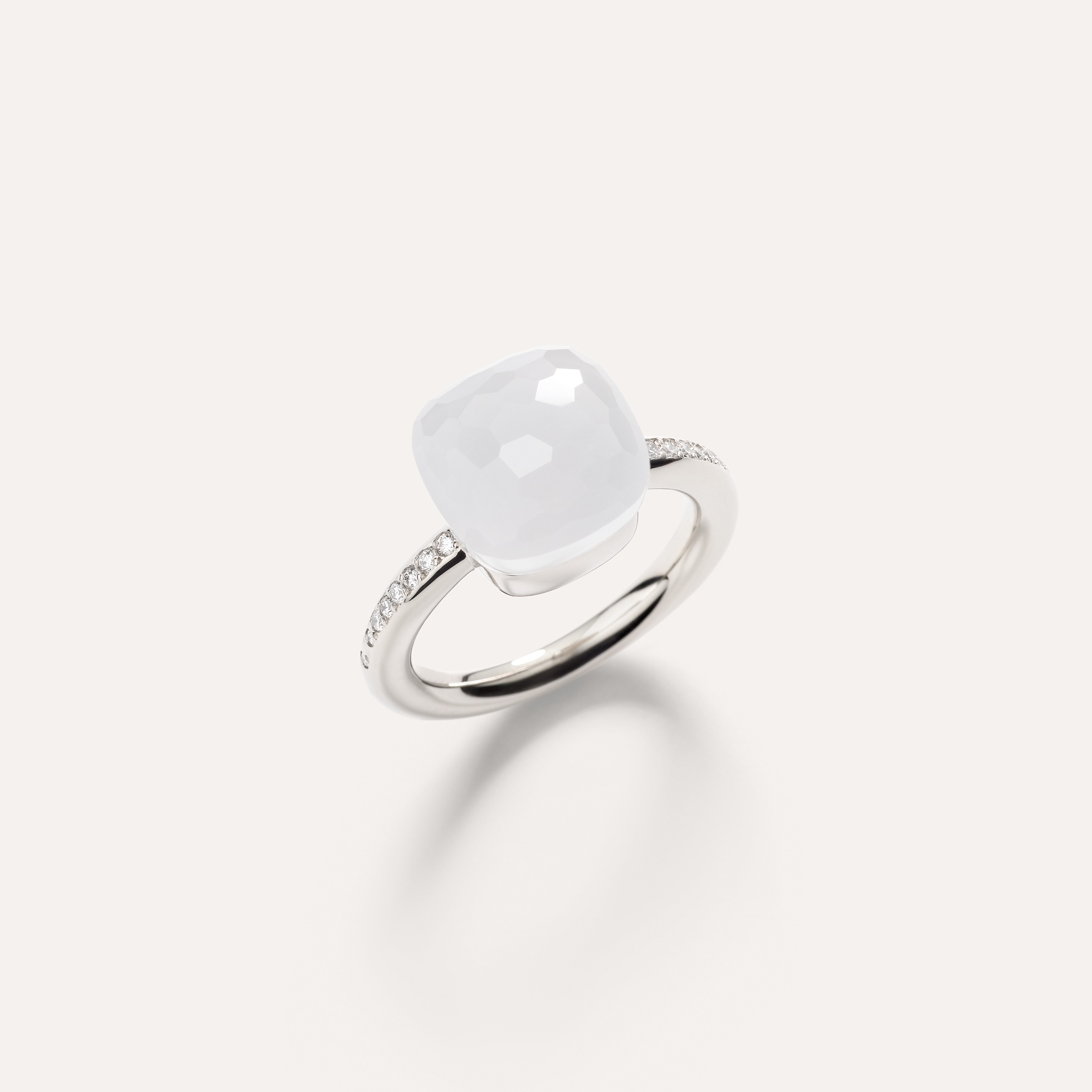 Ever searching for ways to showcase the inner beauty of gemstones, the Nudo Milky presents a translucent creamy white quartz. A Classic ring set in white gold and embellished with diamonds. For the first time Pomellato uses Manganese White Gold, a new alloy that provides a longer lasting, brighter white gold.